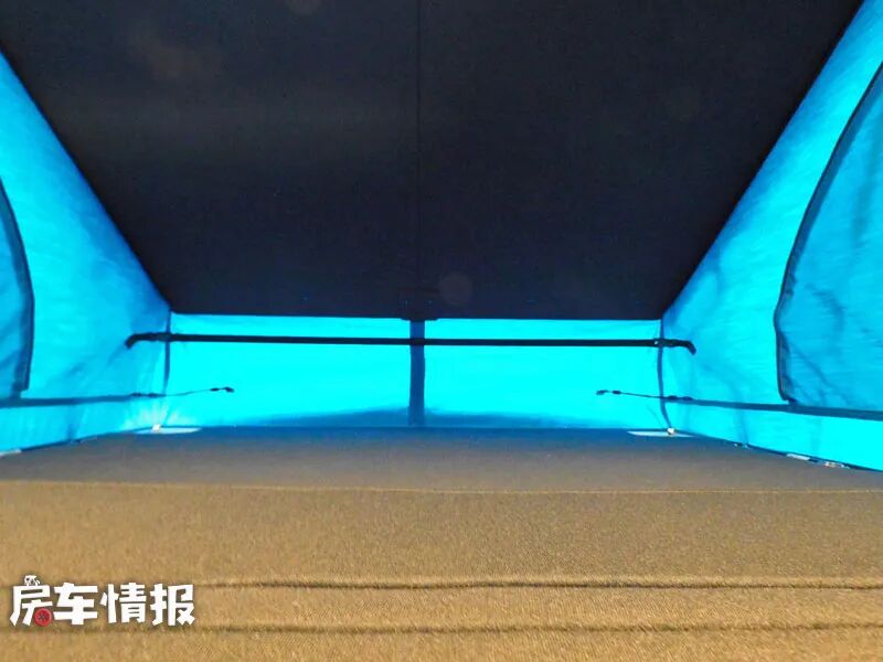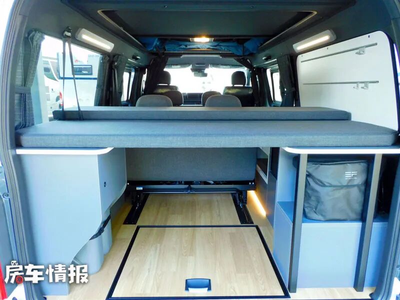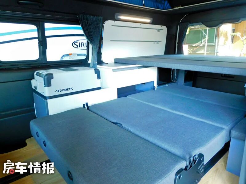 刚才我们说过,这辆车是带有升顶机构的,所以除了下方车厢中的两张床铺之外,在顶部还有一张能够容纳两个人使用的双人床,如此一来,整辆车内部一共提供了三张床铺,虽然它整体的尺寸不足5米,但还是巧妙的利用了车内的空间和布局。