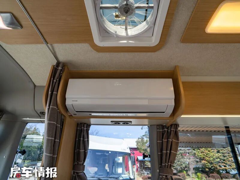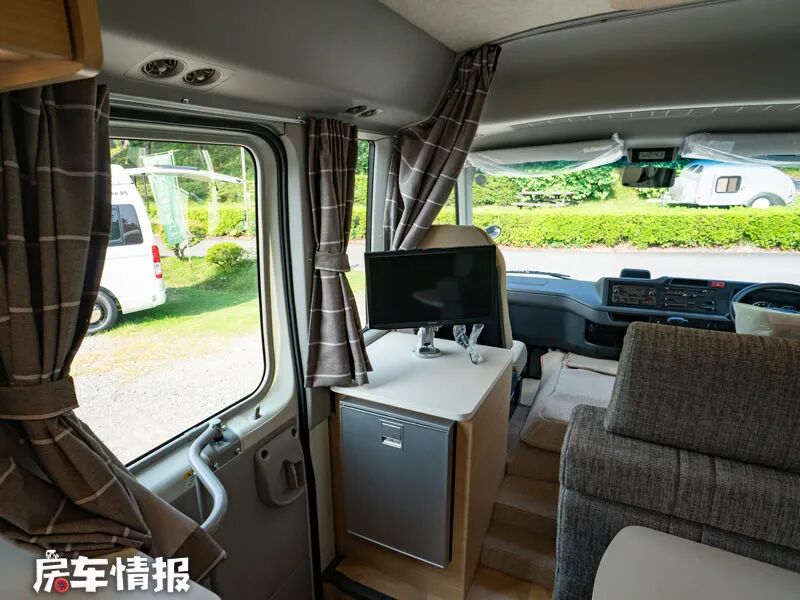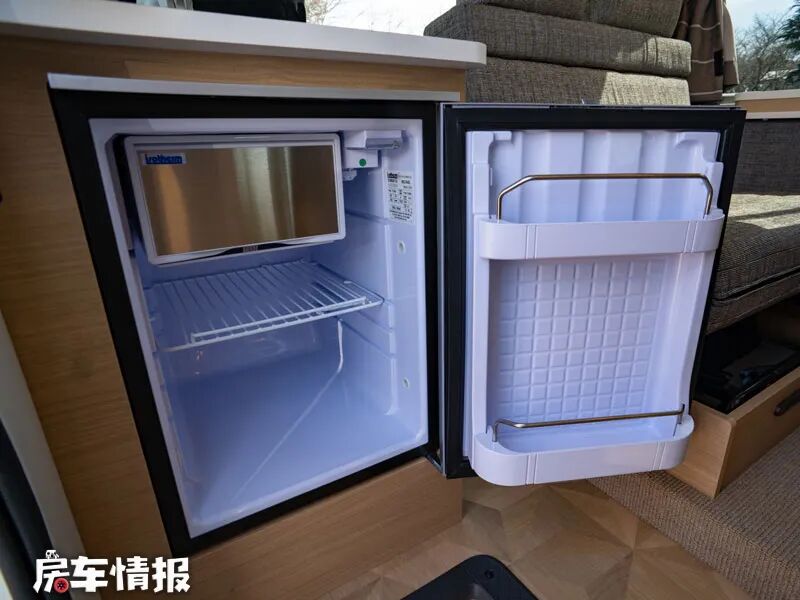 而乘客门前方还设计了一个小型的电视柜,上方提供了一台19寸的液晶电视机,下方是一台49升带有冷冻盒的单开门冰箱,也能够满足一些基础生活所需。