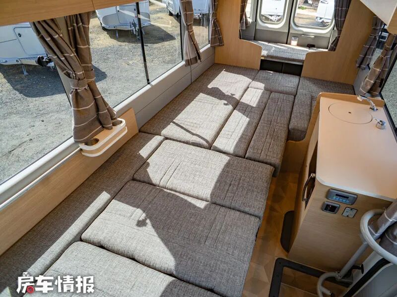 着重要说的是全车内部可以睡觉的地方,一共分为三个区域,第一个区域就是位于前方常规的卡座沙发区,平时行车时可以乘坐,驻车时搭配上大尺寸的餐桌则能够进行简单的就餐和会客,晚上则可以相互拼接成一张小型的沙发床,尺寸为1900*1200毫米。