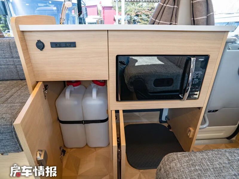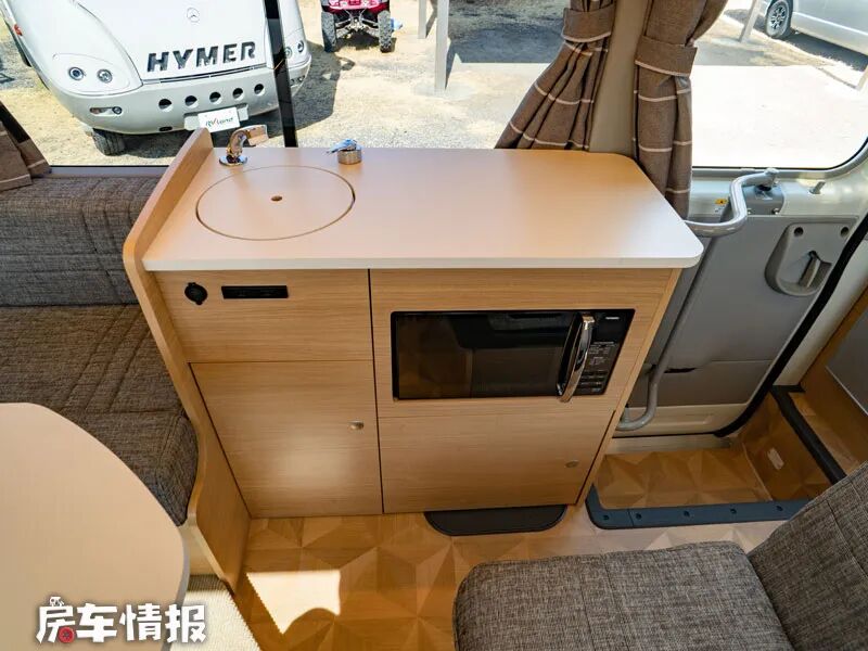 虽然说是一辆大号的床车,但是车内还是提供了一个小型的厨房操作台,位于乘客门的后方,配有带盖板的不锈钢水槽、可抽拉的水龙头、微波炉以及便携式的灶台,简单的烹饪需求还是能够满足的。