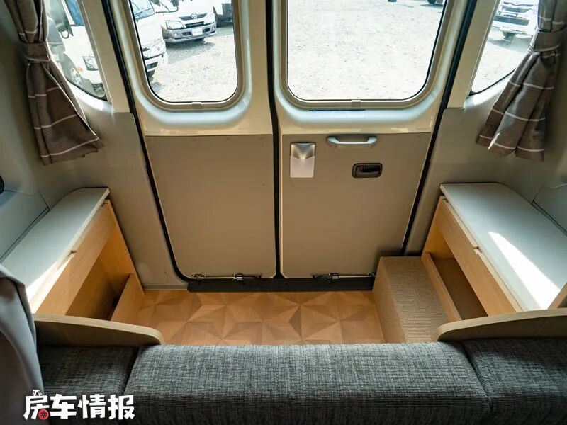 打开双开式的后尾门,还可以看到床板下方的储物空间,也能用来存放一些基础的生活物品。