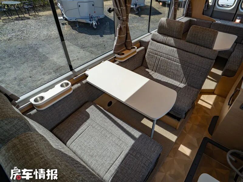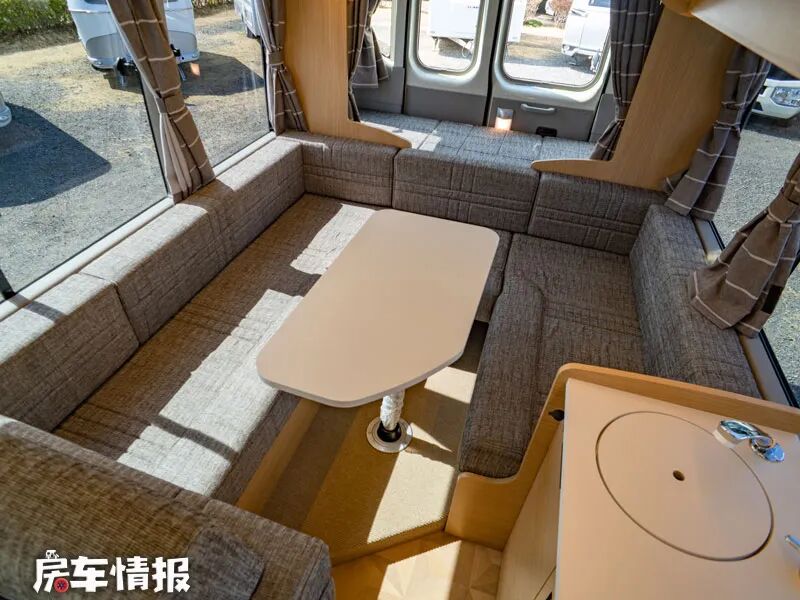 第二处区域则位于车厢的尾部,整体采用了半环绕式卡座沙发的设计,中间提供了一台可升降的餐桌,当朋友来参观的时候,这里也是个不错的聚会地点,能容纳更多的人使用,晚上也可以变成一张大尺寸的床铺,尺寸为1900*1350毫米。