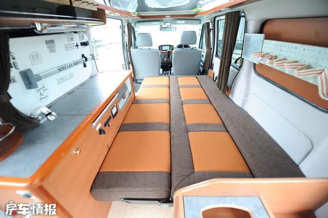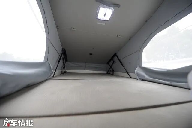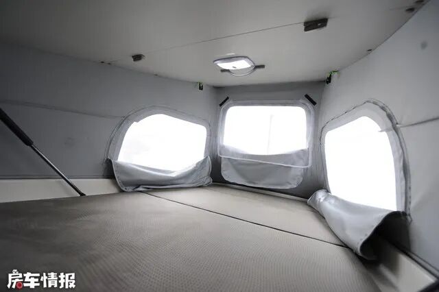 弹出式的车顶可变成一张双人床,三面环窗的设计通透性还是不错的。如果觉得太刺眼还可拉上遮光帘或关闭窗户。