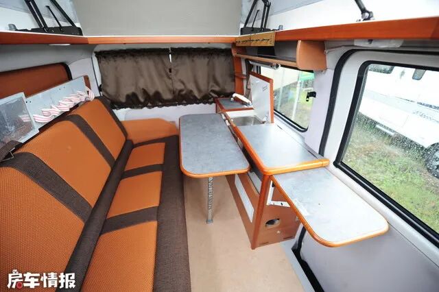 沙发前方则是茶桌,虽然整车空间不算特别宽敞,但是会客区空间还是比较充足的。茶桌的可升降设计使用起来更加方便。在夜间会客区的沙发就可拼成一张可供3-4人休息的床铺,人均休息的面积还是比较大的。