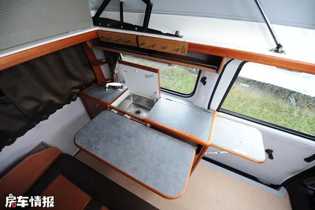 茶桌前方就是车辆的操作台区域,做了三向可折叠的小桌板,展开后桌面的面积还是十分可观的,在驻车时可放置不少的物品。并且水槽也做了折叠设计,掀开桌面即可使用,这一设计也为床车日常使用提供了不少方便,并且提升了桌面的可使用空间。