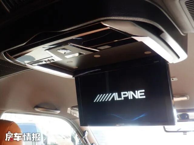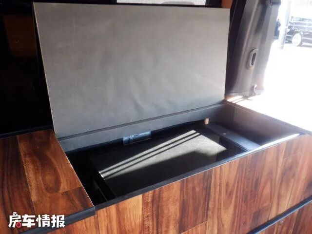 乘客门对面则是一大块的置物平台,尺寸还是比较大的。可放置不少的物品,桌面翻折打开后,可变成一台液晶电视,方便在会客区休息的时候观看节目。