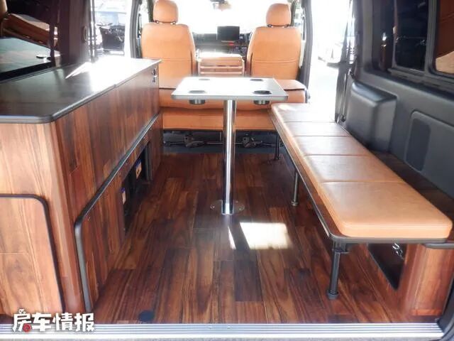 从车厢左侧的乘客们进入到车厢内部,可以发现主副驾后方配备有小沙发,皮质包覆的座椅包裹感很强,日常坐着还是比较舒适的。会客区则是单排乘用车座椅,座椅前方的茶桌可调节高度,腿部空间还是比较充足的,当驻车时可供用餐、娱乐。