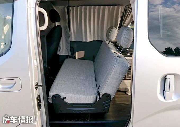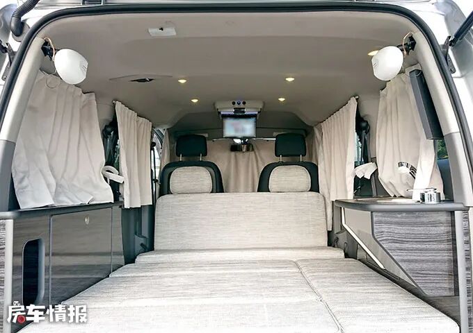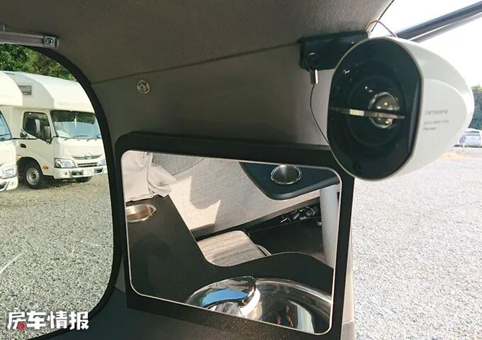 乘用车座椅后方是床车的休息区,用于搭建一张可供休息的床铺,可容纳3人在此休息,宽度和长度还是比较优越的。日本床车也会专门设计出储物空间,在床铺左侧可放置一些个人物品,这一点还是比较人性化的。在后方的左右两侧都安装有后置摄像头,安全性可得到保证。