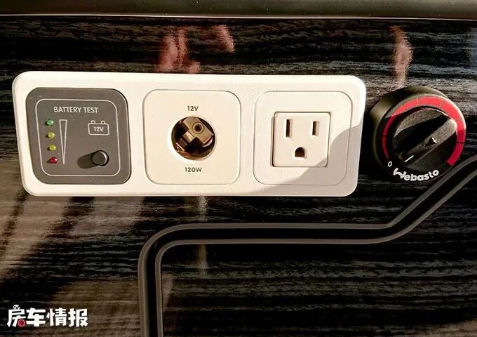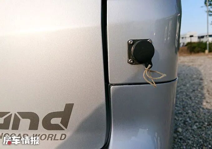 与大多房车不同,这辆床车的充电口在车尾部,电路方面整车配备有500瓦逆变器,70安时锂电池,210瓦的太阳能电池板。水路则安装了12升的清水箱。