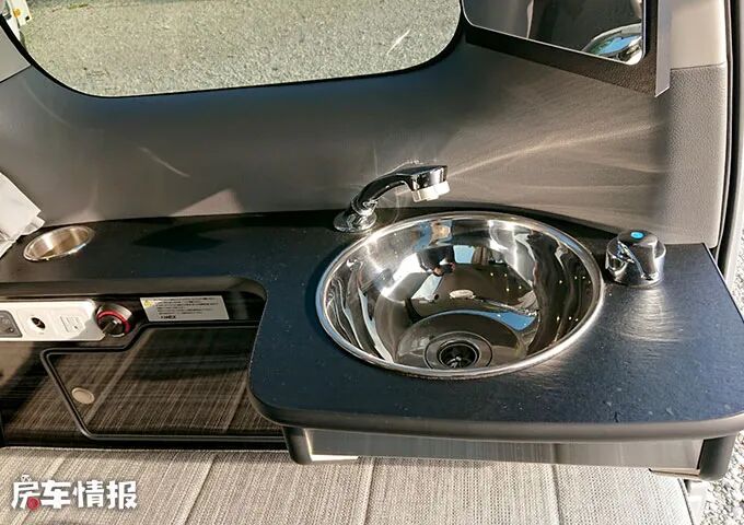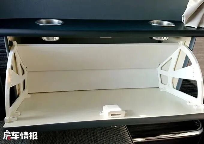 在床铺右侧是一块小型的置物平台,洗手池做了可拉出的水龙头,也可拉出车外来使用。桌面配备有杯架,这个位置随手放置杯子还是比较方便的,杯架下方则是一些电的控制开关。