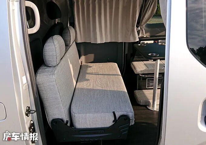 整车的主要配色还是以灰色为主,配备有可升降的茶桌,调节高度比较方便。主副驾后方是三人联排座椅,空间还是比较宽敞的,坐着时也不会感觉顶腿,这种座椅就比较舒适,即使是长途出行时需久坐也不会特别痛苦。即使茶桌尺寸不是很大,这辆床车还是在桌面配备了置杯架。在茶桌左侧还有一个单人位的座椅,整个会客区是可容纳3-4人在此乘坐的,那么车内用于开小型会议或移动办公都是不错的选择。