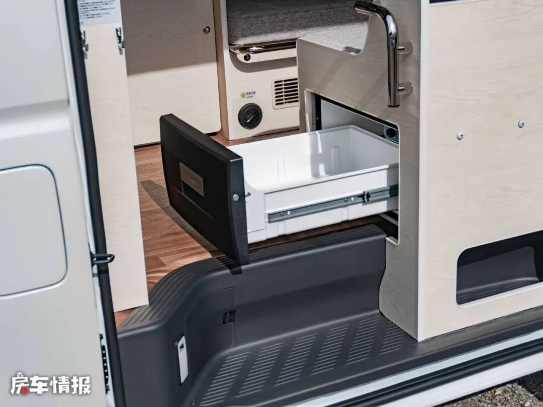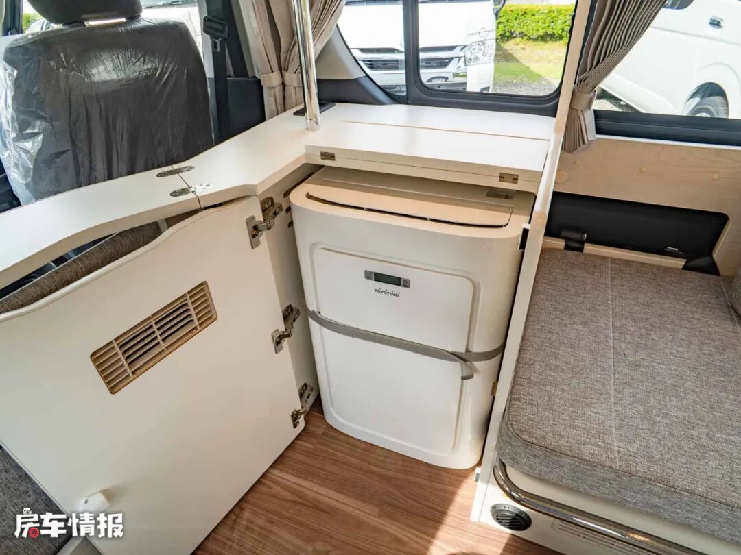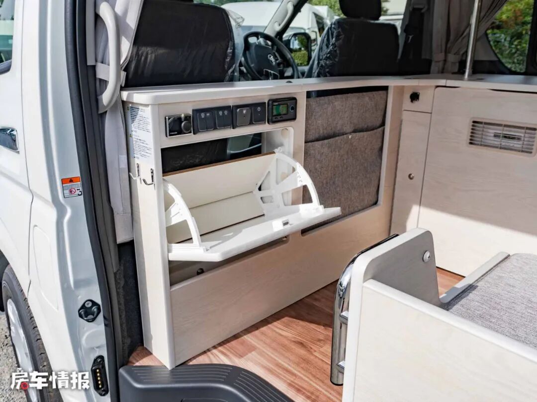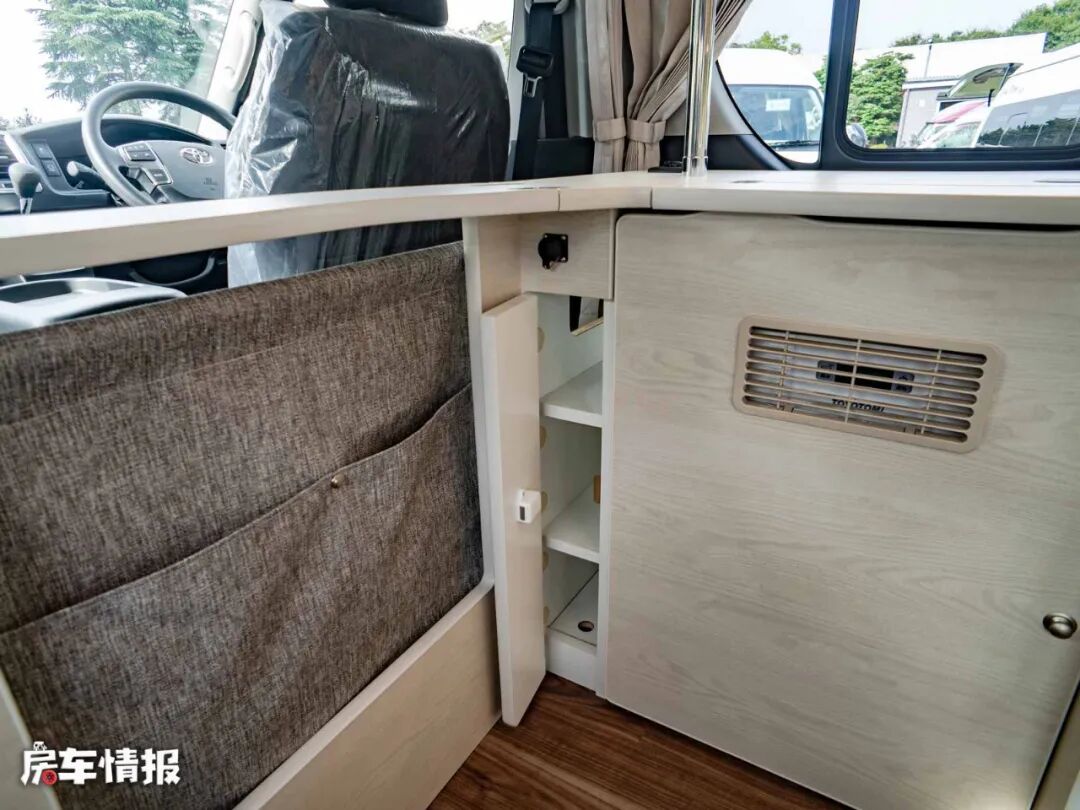 从车厢左侧的乘客门进入车辆内部,可以看到在主副驾驶座椅后方是设计了L型操作台,在操作台下方还有置物柜的设计。令人惊喜的是车门对面的操作台打开后下部就是一台立式空调,空调旁还有小型的储物格子,可将空间最大化利用。