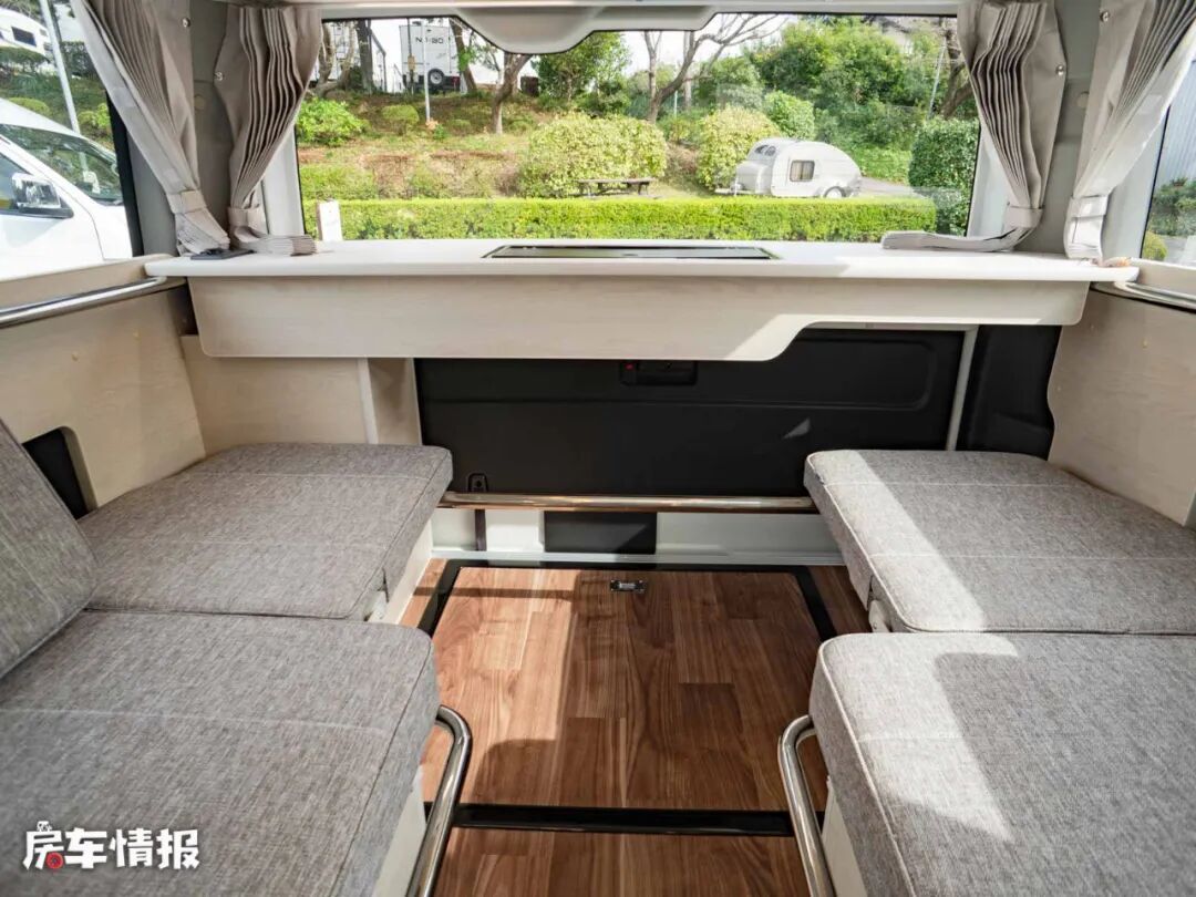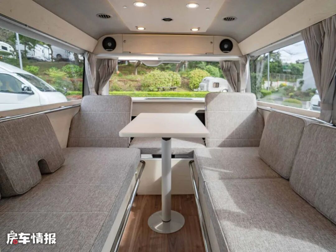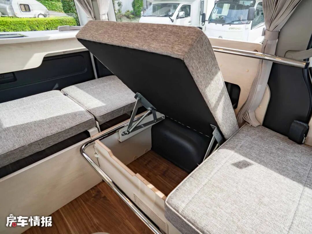 U型沙发横置部分做了可拆卸设计,收起后通往车尾更方便,并且空间不小,车内走动时不用担心会不小心磕到腿或是侧身通过。