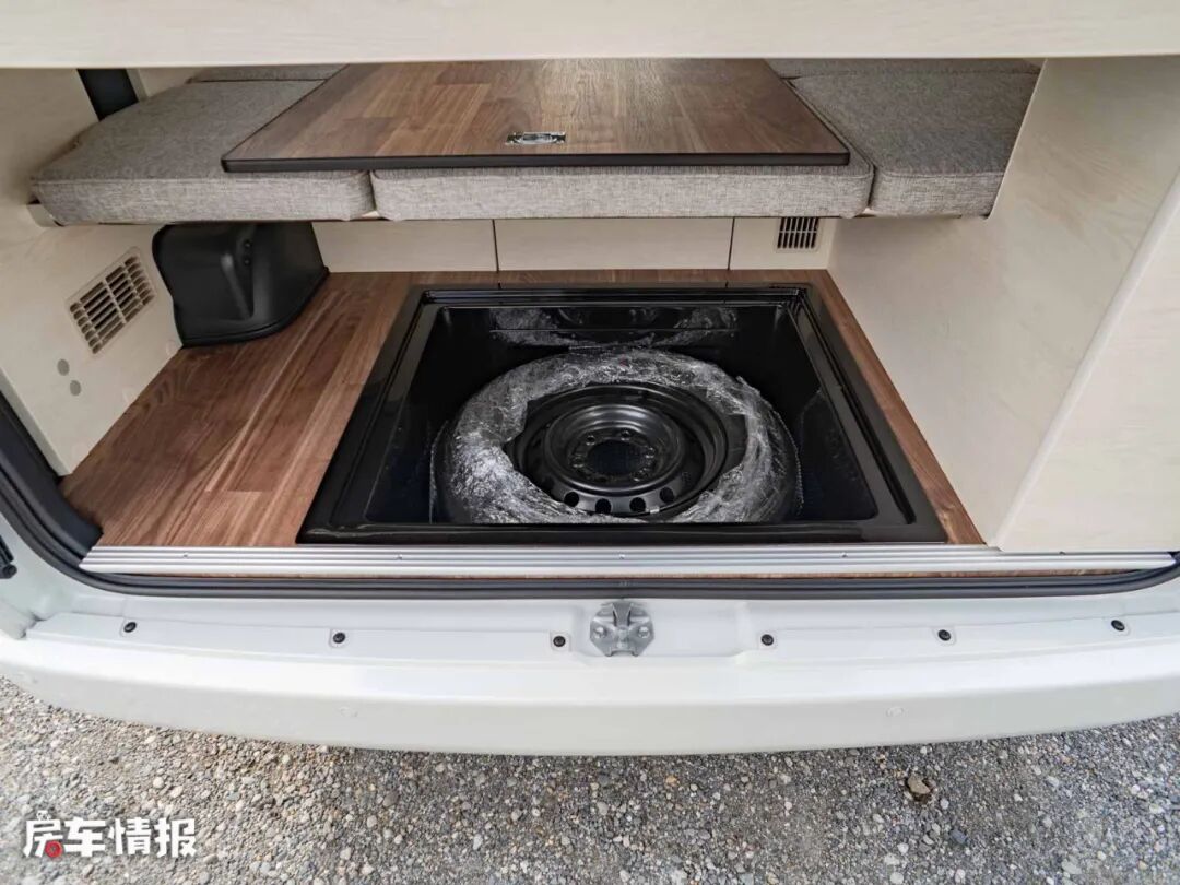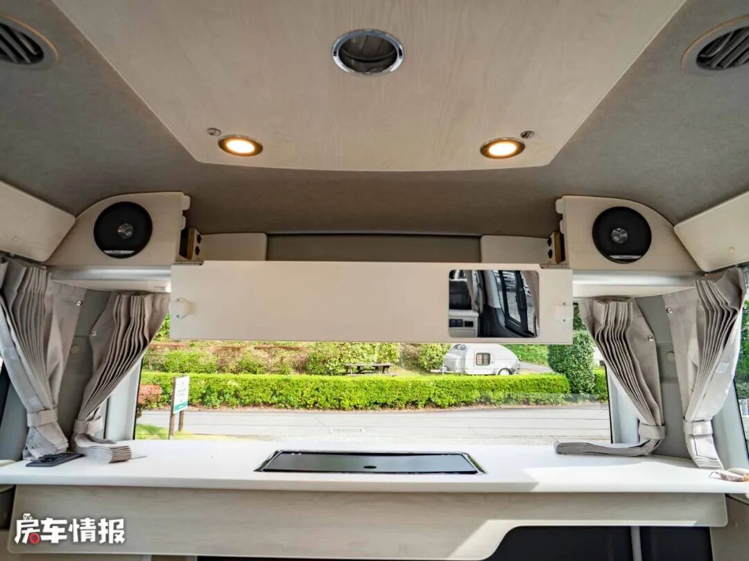 夜间就可将沙发拼成一张可供3个人在此休息的床铺,尺寸还是比较大的。在车尾部上方还有置物柜,随身的小物件都可放置在这里,带梳妆镜这一设计是比较人性化的。