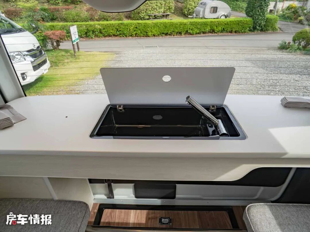 车尾部是厨房区,横向的操作台尺寸不小,台面上提供了基础的不锈钢水槽及水龙头,拉出式设计后期也可以在车外使用,操作台下方是燃气灶,这个位置设计还是比较巧妙的,只不过这个位置可要注意烹饪时不要弄脏前方的沙发了。