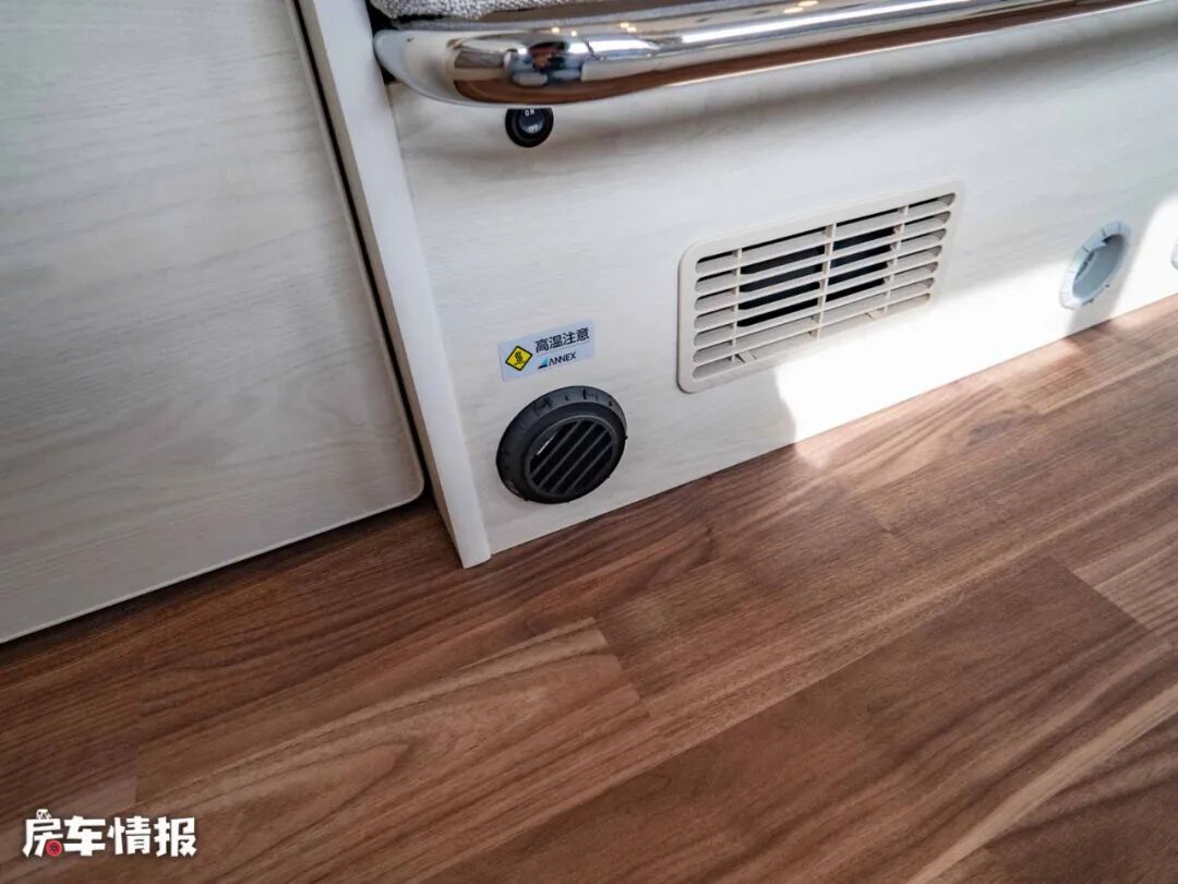 在桌面侧面上方配备有置物格,空间充裕。收纳随车携带的物品比较方便。换气窗不小,通透性不错。