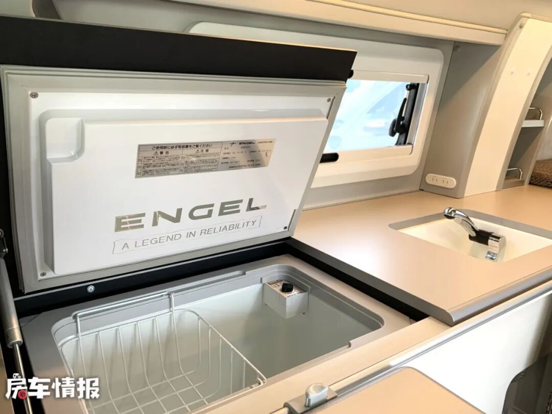 座椅侧面是厨房区域,与以往的床车不同,这辆车采用了车载冰柜的设计,不打开时也能作为操作台的一部分来放置物品。并且相较于冰箱,冷冻食品的能力提高了,这有了这个大冰柜,夏天出门卖冰棍和饮品都可以。在冰箱侧面做了可拉出的小桌板,进一步提升了桌面空间。洗菜池的深度是不错的,并且水龙头做了可拉出式设计,通过外推窗拿到室外使用也是很方便的。