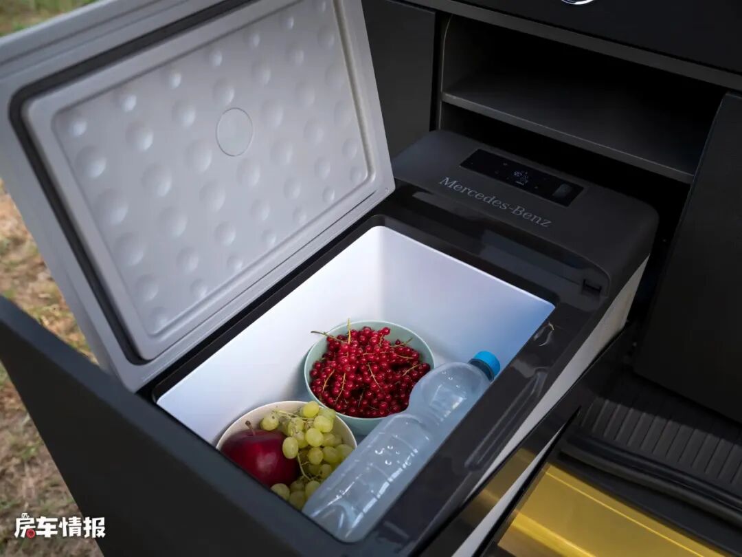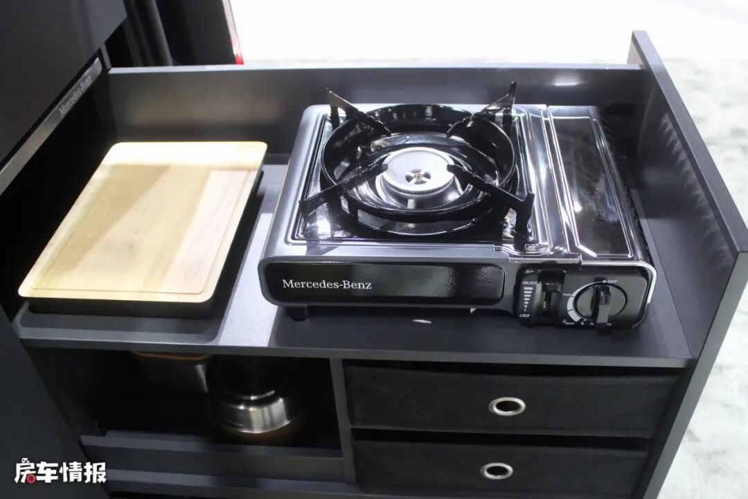 室外厨房则安装在车尾的后挡板处,这个设计确实是别出心裁了,便携式燃气灶上还有奔驰的徽章LOGO,燃气灶旁则是置物托盘,木质的托盘质感不错,并且表面做了疏油涂层处理,可以经得住时间和路程的考验。燃气灶下方则是大型的储物空间,可滑出的T型水槽后连接有12升的水箱,冰箱的容积15升,还配备有两把椅子和一张桌子,可随车携带,在休闲、用餐时在户外使用。