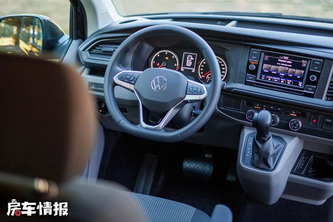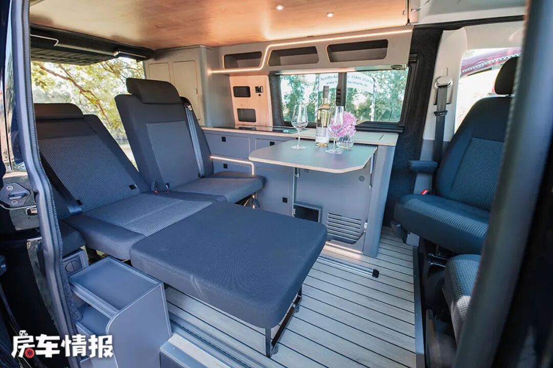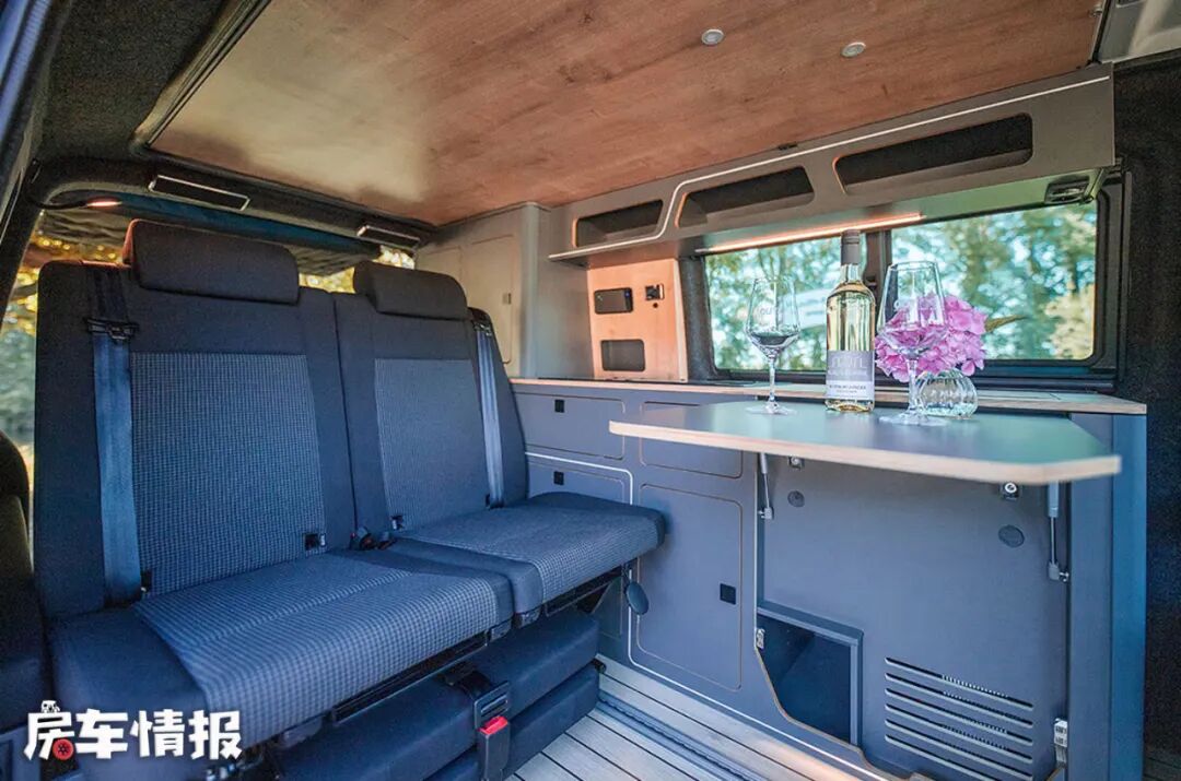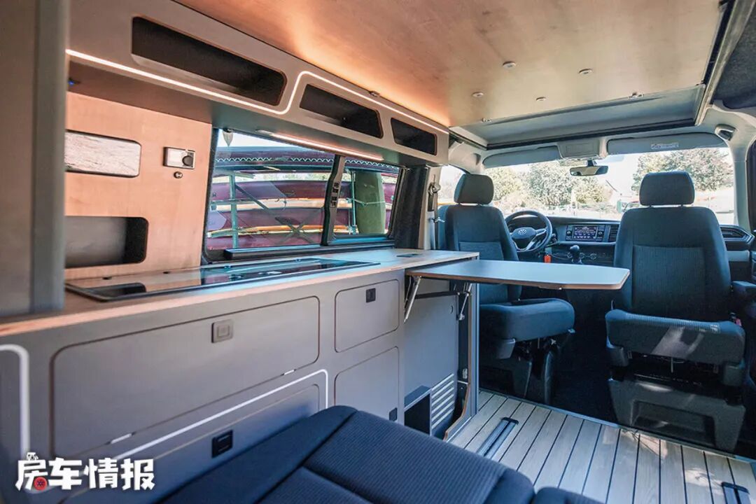 驾驶室内部与普通家用车一致,大众风格还是比较明显的。正副驾座椅可旋转式设计,与后方的会客区轻松就可构建成面对面吃饭、休息的空间。会客区座椅带有倾斜靠背功能,乘车时也不用一定直立坐在车内,可调节角度的座椅可真是太棒了。