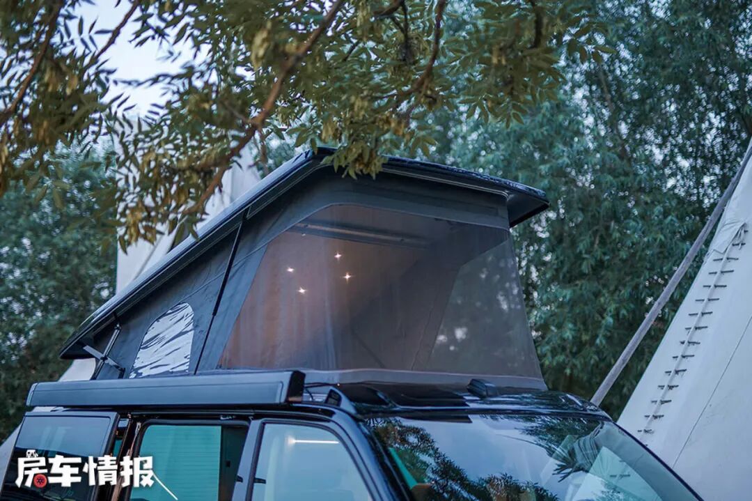 休息区域除了前文提到的沙发床外,第二张则是可弹出车顶处的弹簧框架床,打开后可供两人休息。这张床还是不小的,弹出后在这休息还可以看风景,透气性也是不错的。