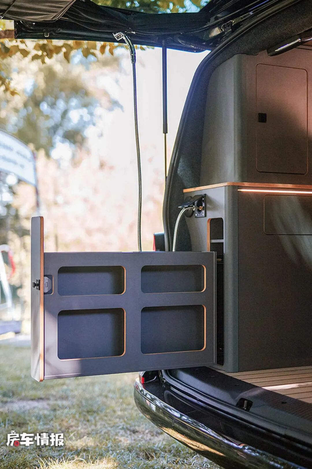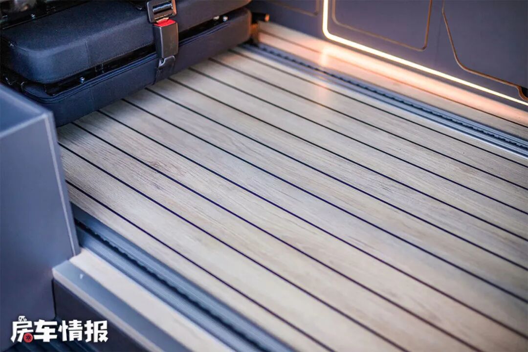 由于是露营车,所以车内没有配备卫生间,在车尾后安装了室外淋浴间,花洒可以挂在敞开的后挡板上,在这接水确实不太常见,还是比较新鲜的。