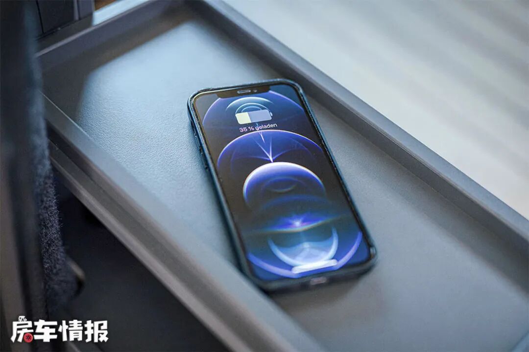 会客区的座椅采用分体式设计,向下折叠就能与脚凳组合成床。这个设计比较人性化,想要休息时就能随时个性化调节折叠成床铺。这张床可容纳两个成年人休息,舒适度还是不错的。在床侧还有无线充电板,在放置电子设备的同时还能无线充电。