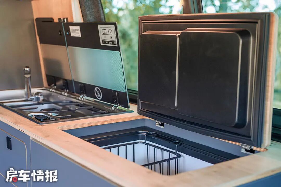 再来看看室内厨房,操作台上配备有双灶头炉灶,可同时烹饪美食来提高效率。带盖洗菜池容量不小,合上后可形成平面便于放置物品。桌面上还有40升的冰箱同样关上盖子后与操作台高度一致,方便放置物品。