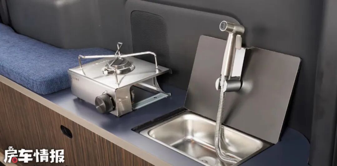 可能有的朋友会想问了,这么大的会客区,车内厨房和休息的地方是不是很小呢?当然不是,这款床车的车内厨房隐藏在床垫下方。将床垫拿起就会发现别有洞天了,这个车内厨房有便携式燃气灶以及带盖洗菜池,水龙头是可拉出设计的,使用时将水龙头拉出即可在车内完成接水不弄脏床垫,并且想在哪里接水都可以,因为这个淋浴器长度设计是很人性化的。