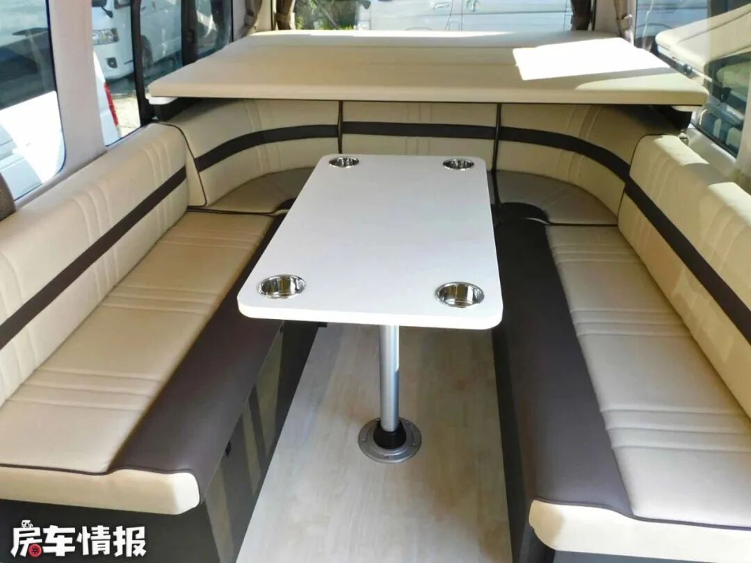 在主驾驶后方还有一个双人座椅,便于与U型沙发上的人面对面开会或是娱乐。这一设计比较人性化,生活区四向都有座椅,日常休息时也可根据需求来选择位置,还可以四人在这里打麻将、玩扑克。需要休息时将茶桌降下、驾驶室后方单排座椅放平就可以拼成一张三人床。