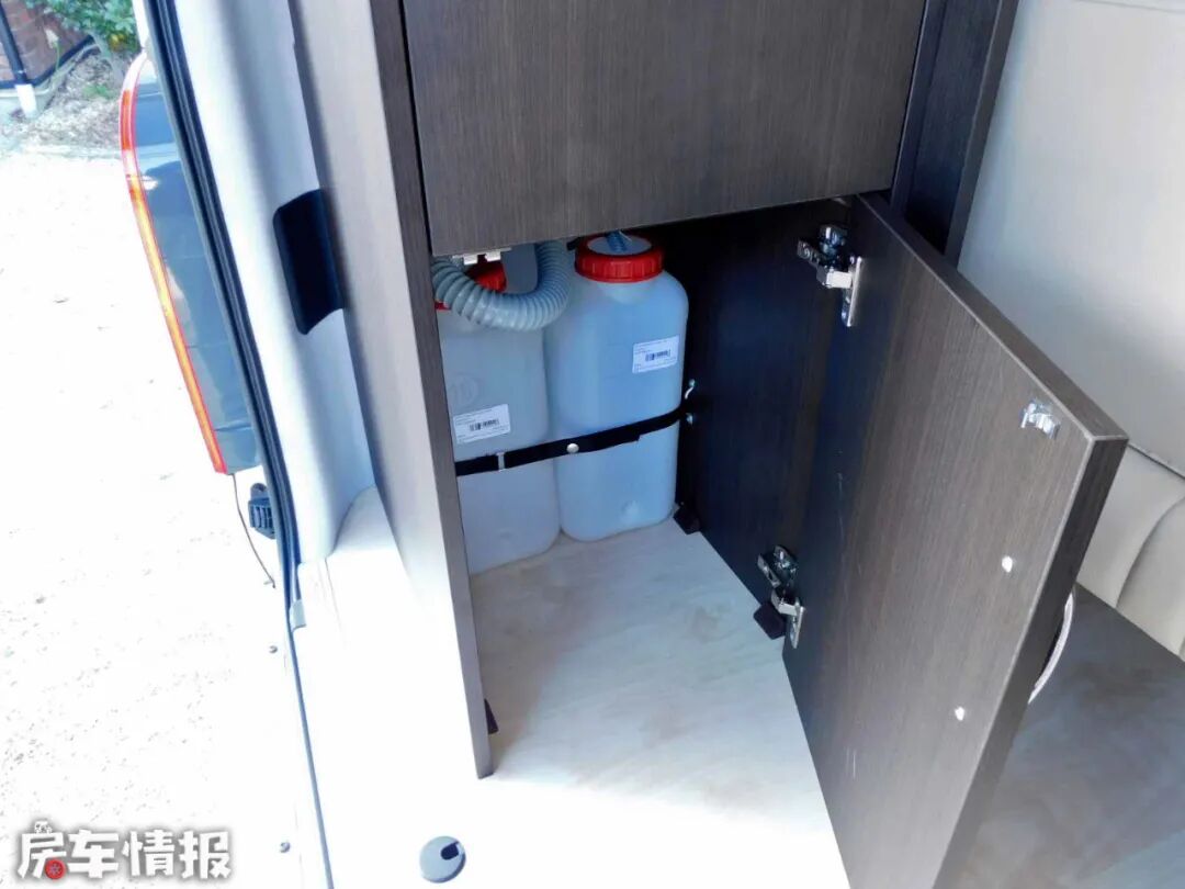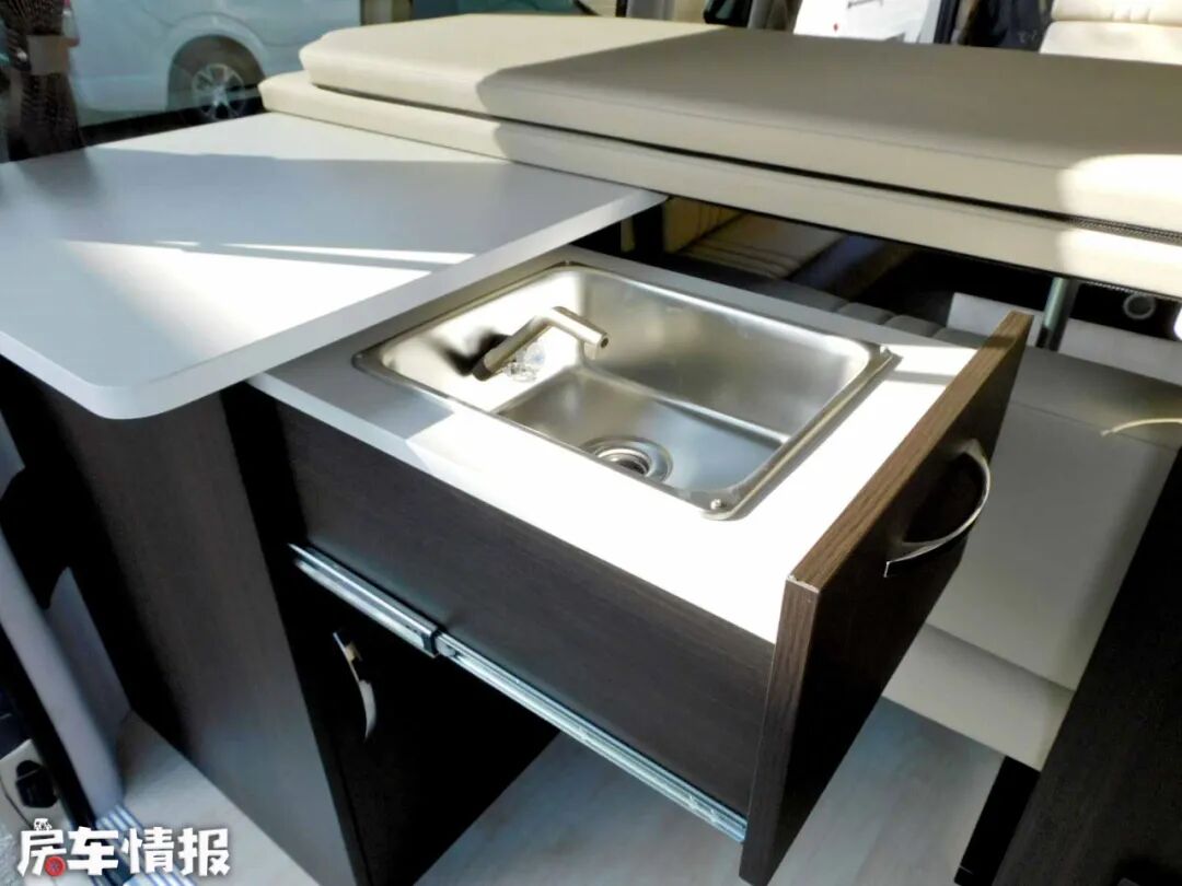 在车尾部有一块厨房区域,打开抽屉是一个洗菜池,在桌面放置物品,下方还能接水,这个设计比较有趣,在洗菜池下方就是水箱,日常用水就储备在这里。
