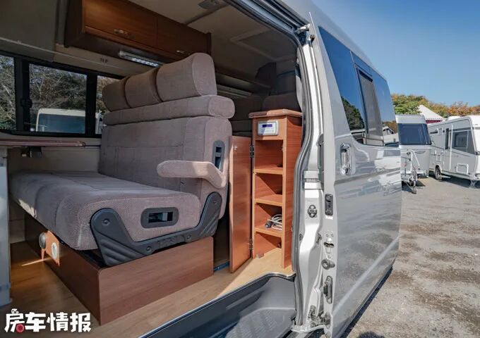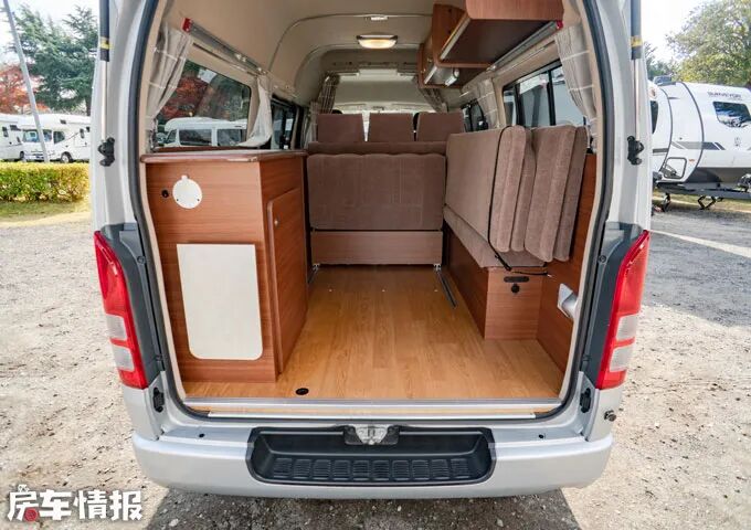 车辆后部整体由沙发组成,休息时可将沙发拼床,尺寸为1.5m*2.0m,可以睡下2-3人。整体空间不小,一家人出游夜间休息问题都可以得到解决。