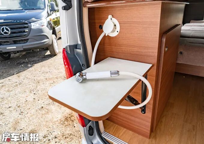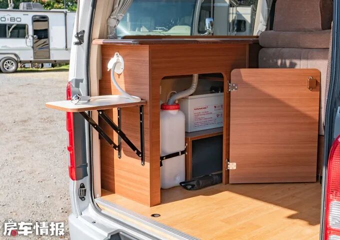 车尾门是可以打开的,尾部安装有可拓展小桌板,整个厨房区域都集中在尾部了,操作台尺寸不小,侧面水龙头做了拉出设计,在车外接水也很方便。操作台下方是储物空间,可放置水箱。