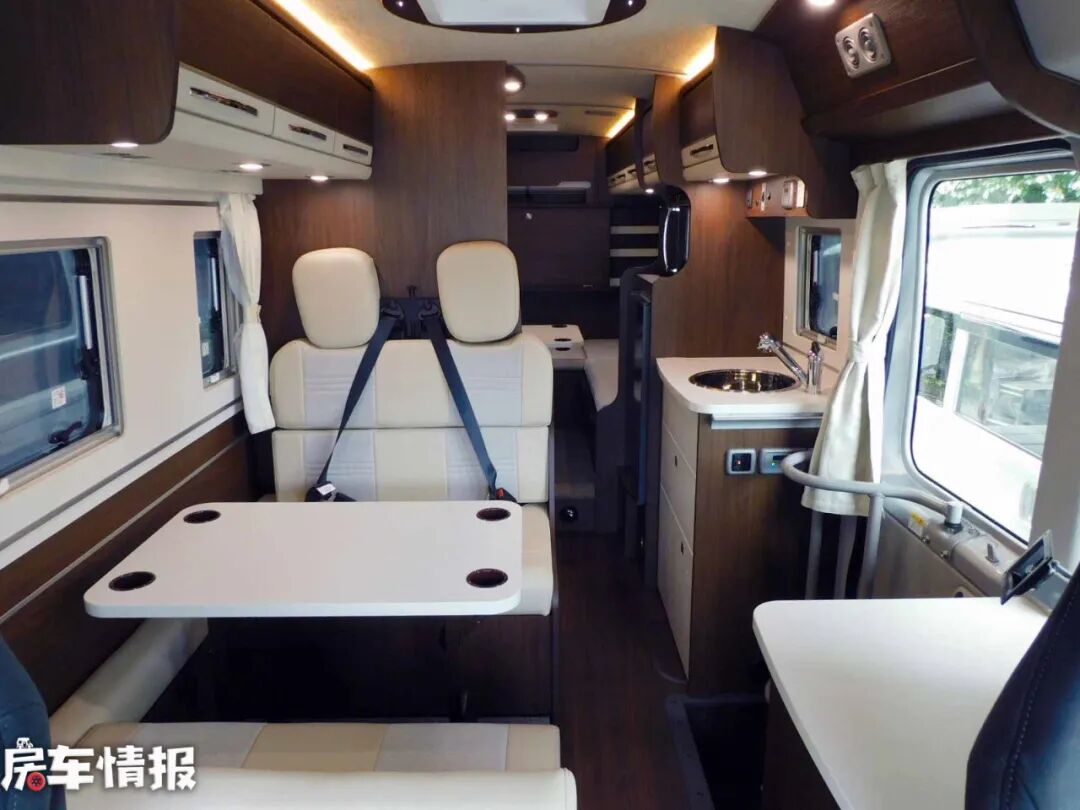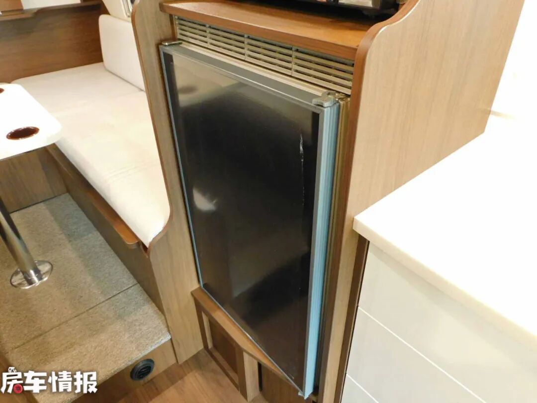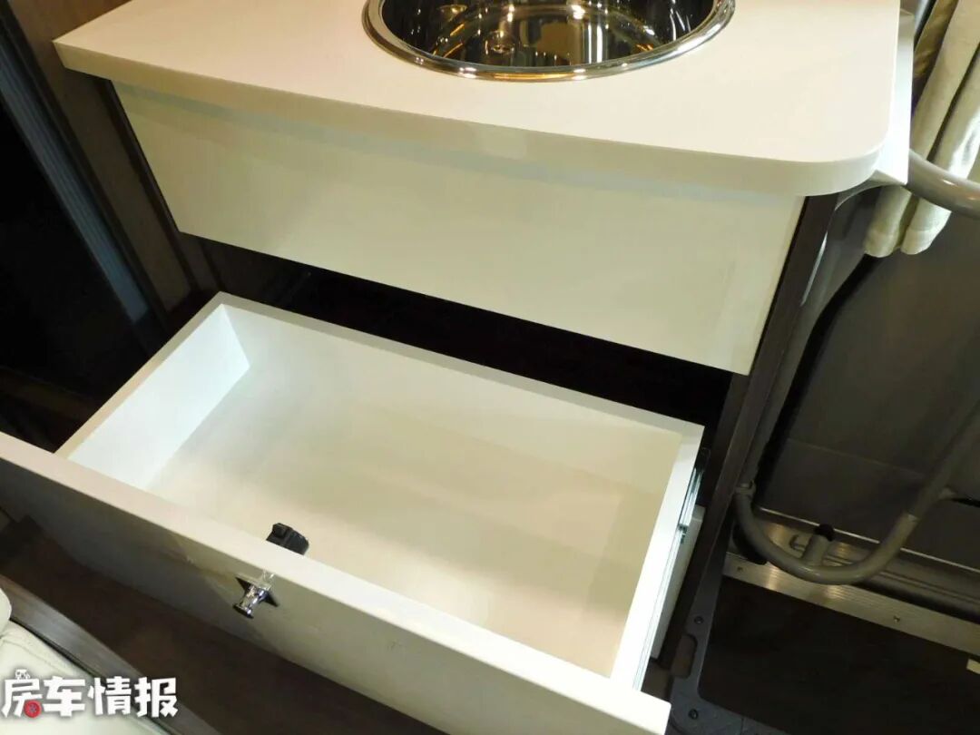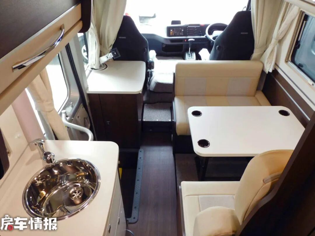 对卡坐沙发对面是车内的厨房区域,由于这款车的侧门位于车厢中部,因此厨房位置被放在了驾驶室后方,厨房内提供的设备非常齐全,有洗手池、冰箱、抽屉、微波炉。