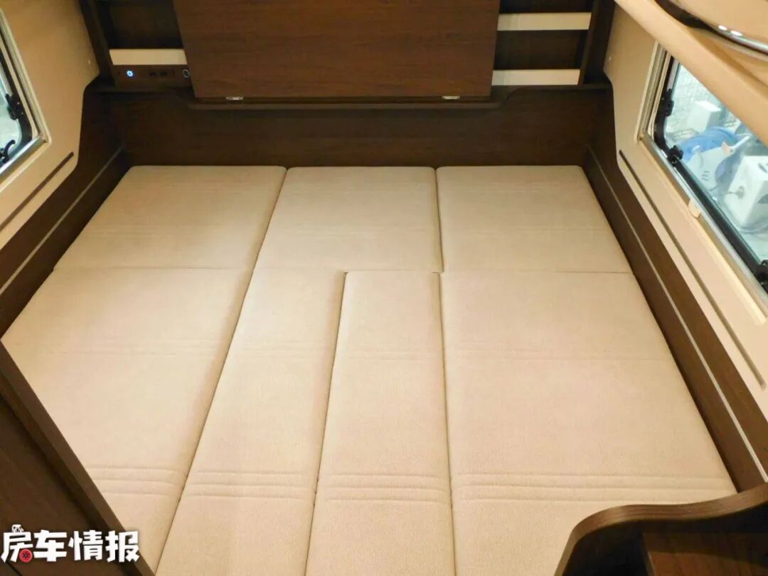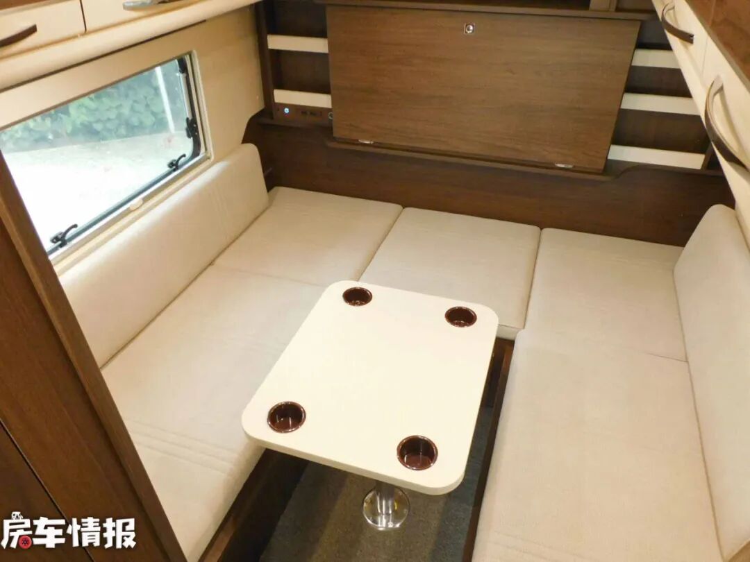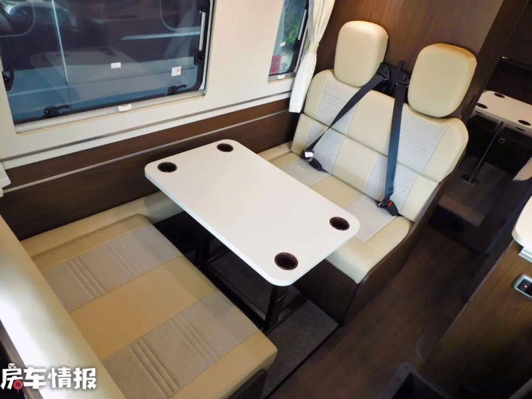 在车尾部是一块U型沙发,茶桌可升降,夜晚就能降下拼成一张双人床,两侧都有大尺寸的窗,在这里商务会谈或是休闲都很舒适,并且上方还有变频空调和换气扇可随时调节温度。