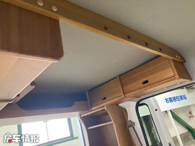 在两侧都安装了组合吊柜,便于存放个人物品,别看这款车尺寸不是很大,但是储物空间还是比较充足的,也便于分类放置行李。