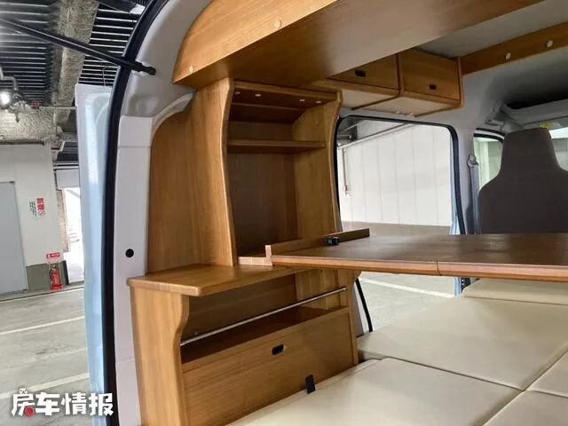 在尾部还有一大块的置物空间,看起来有些像书架,当然也可以分层放置其他物品。这个实木家具提升了车内的整体质感,将两端柜子连接起来就是一张单人床,不得不说每一寸空间都被利用起来,设计还是比较合理的。