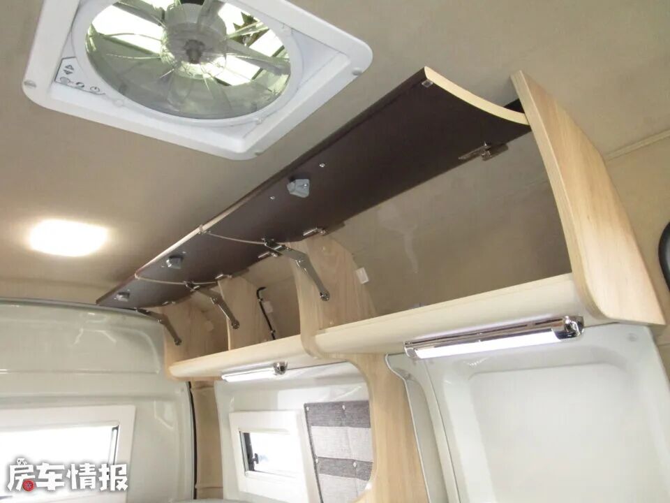 那还有一整排的的吊柜方便放置物品。并且为了便于烹饪,在车顶还有双向换气扇。便于交换空气,而且换气扇做了雨感设置,在下雨天可自动关闭。