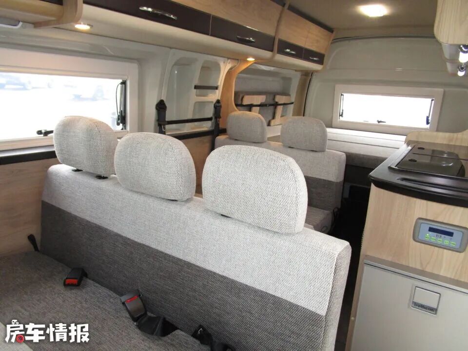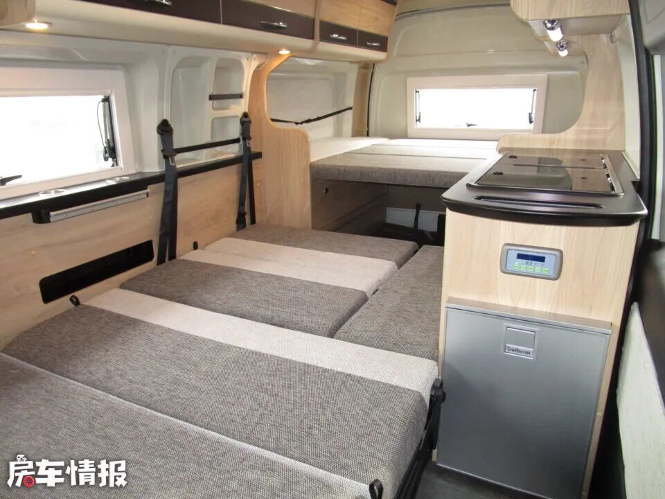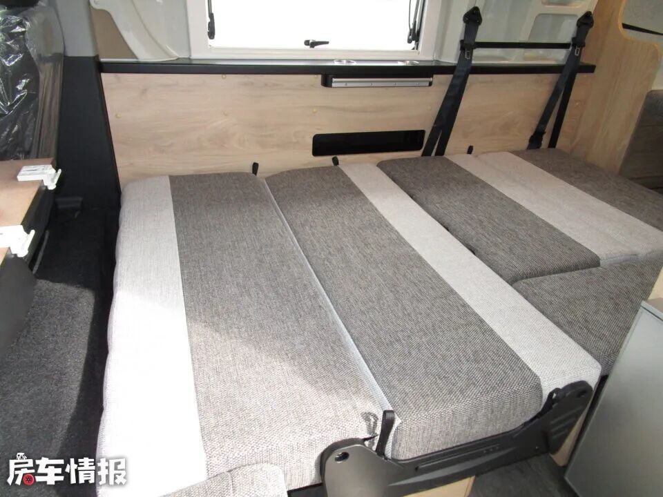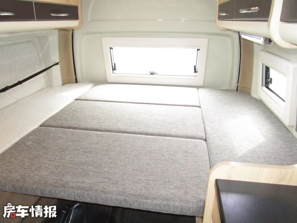 在夜间需要休息时可将两排座椅折叠变成一张双人床可供休息。双人床尺寸还是不小的。如果觉得这样不够的话,在车尾部还有一张横置床,即使不使用沙发床也是可以满足休息需求的。