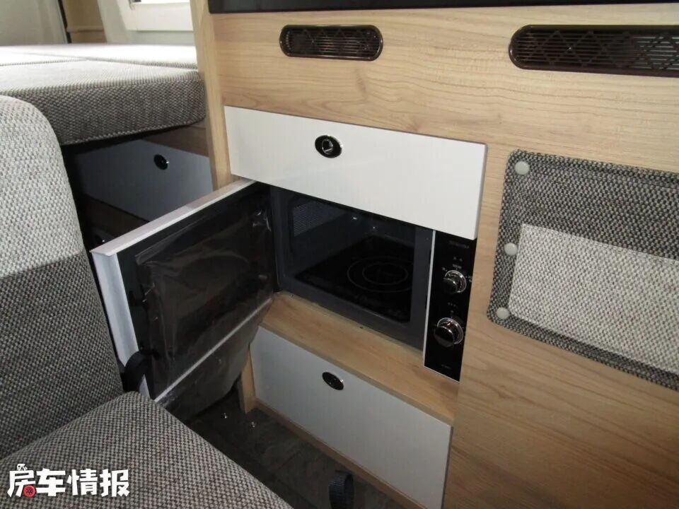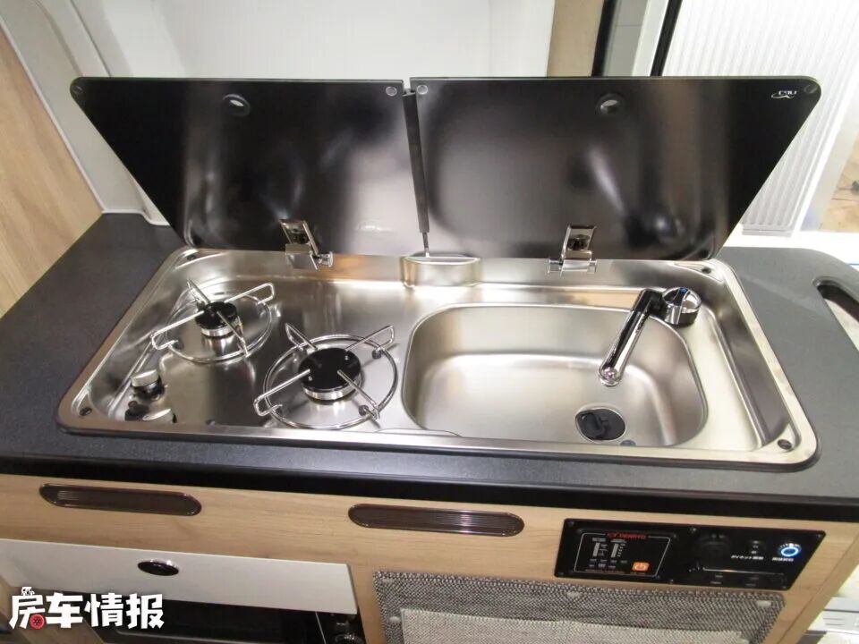 车内部的厨房区域在日系房车中还是较宽敞的。双头炉灶以及洗菜池都是带盖设计,更加卫生。并且在不使用时也可以节约操作台面积。在操作台侧面还有整车的控制面板。可以用来查看电路的使用情况以及操控车内的灯光。一起微波炉的位置设置的也比较人性化。不会太高或是太矮不方便拿取食品,在车内加热牛奶或加热食品都是可以的。