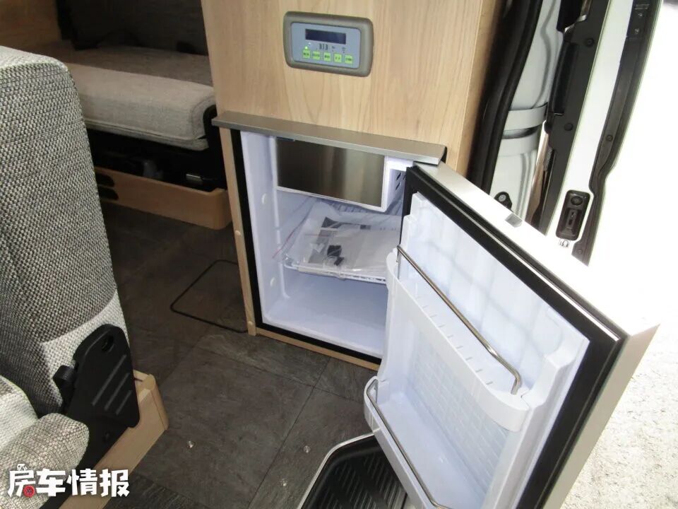 在车辆一上门处就配备了有房车专用冰箱,可以随车携带食品以及冷冻饮品,在夏日不变保存食物的时候,这个冰箱还是很实用的。