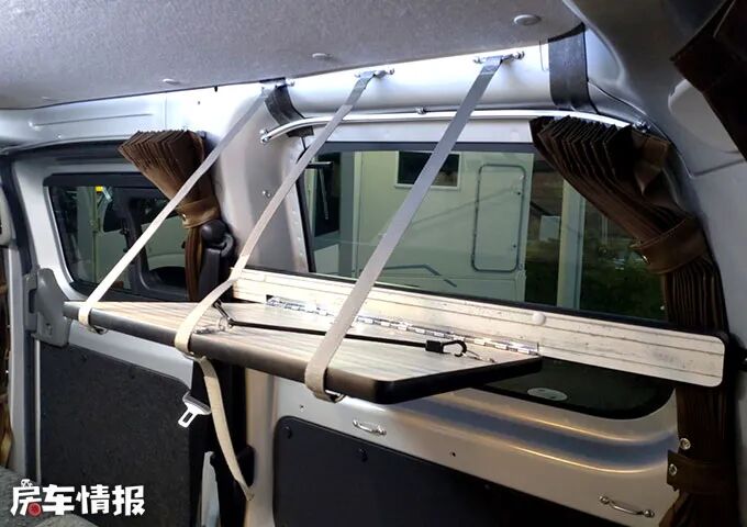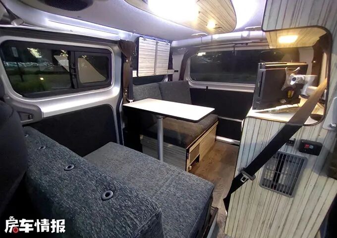 车内还有很多人性化的设计,比如车尾部可折叠的小桌板,既保证了安全性又提升了日常的便利。电路方面,整车采用2000瓦逆变器,还有两块95安时的锂电池。