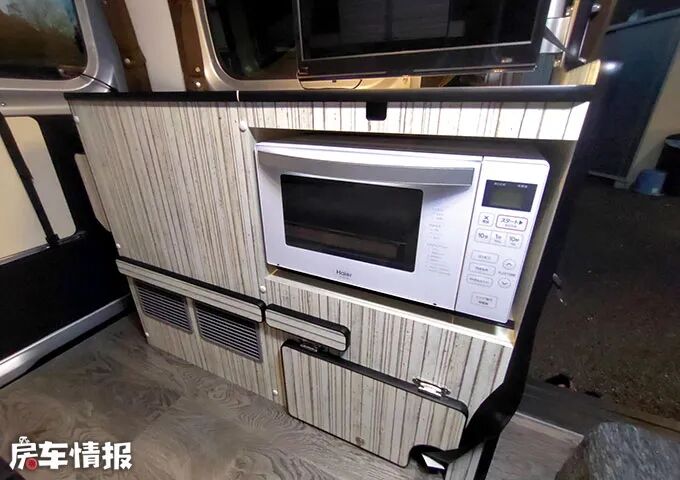 在这块桌子中间做了嵌入式设计的微波炉,所以在使用上是比较方便的,同时也节省了大部分的空间。在桌侧还有大块储物格,无论是躺在床上拿取物品还是打开车后门拿取都很方便。