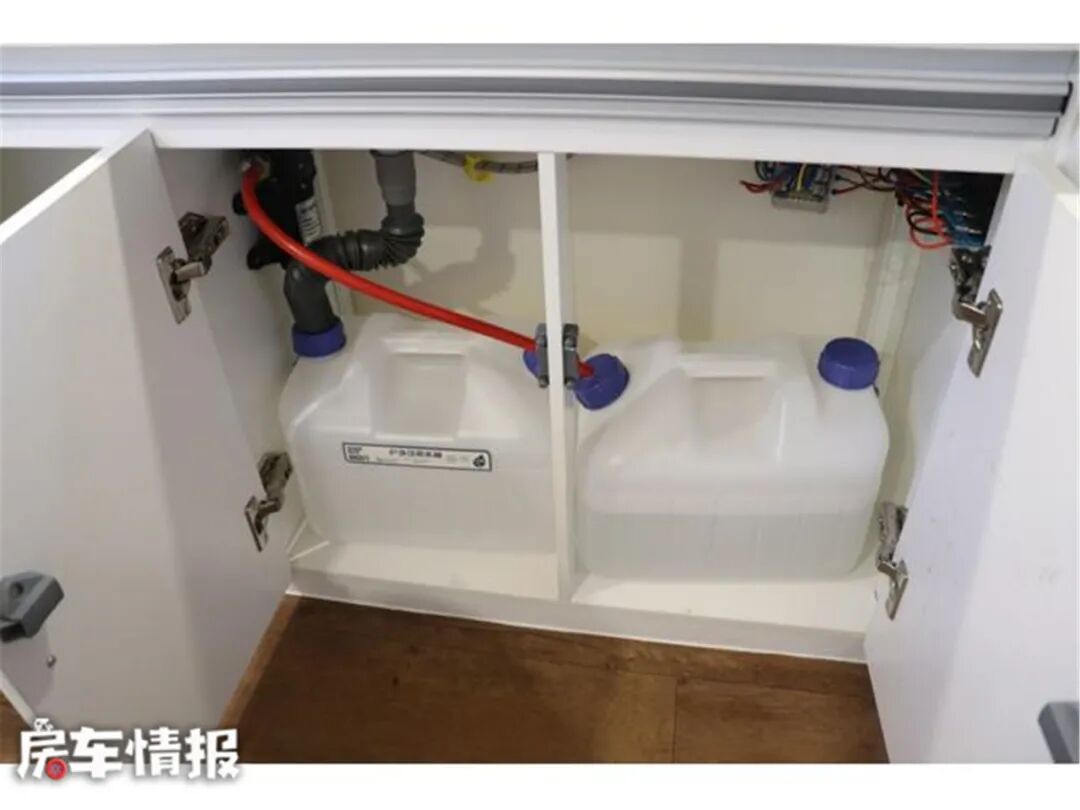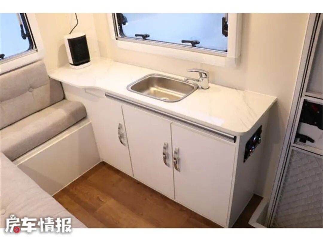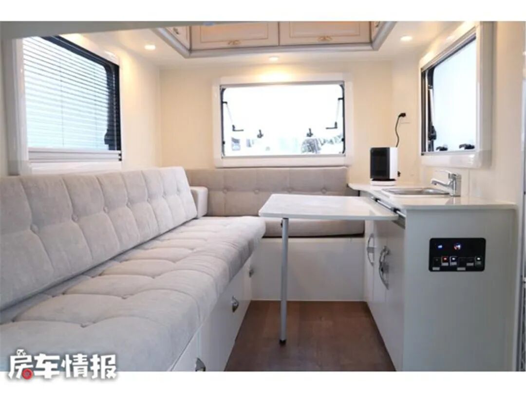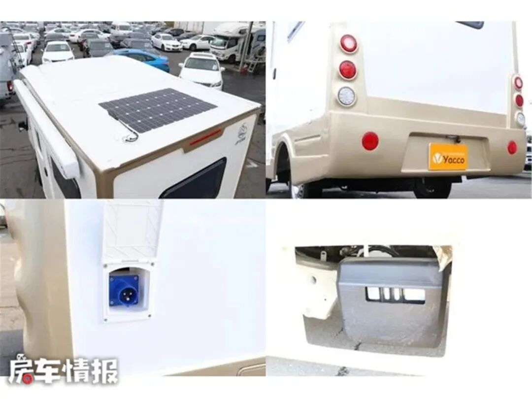 水电方面,这款房车配备100AH铅酸电池,2000W逆变器,100V电源插座,车顶带有太阳能电池板,加热器等。