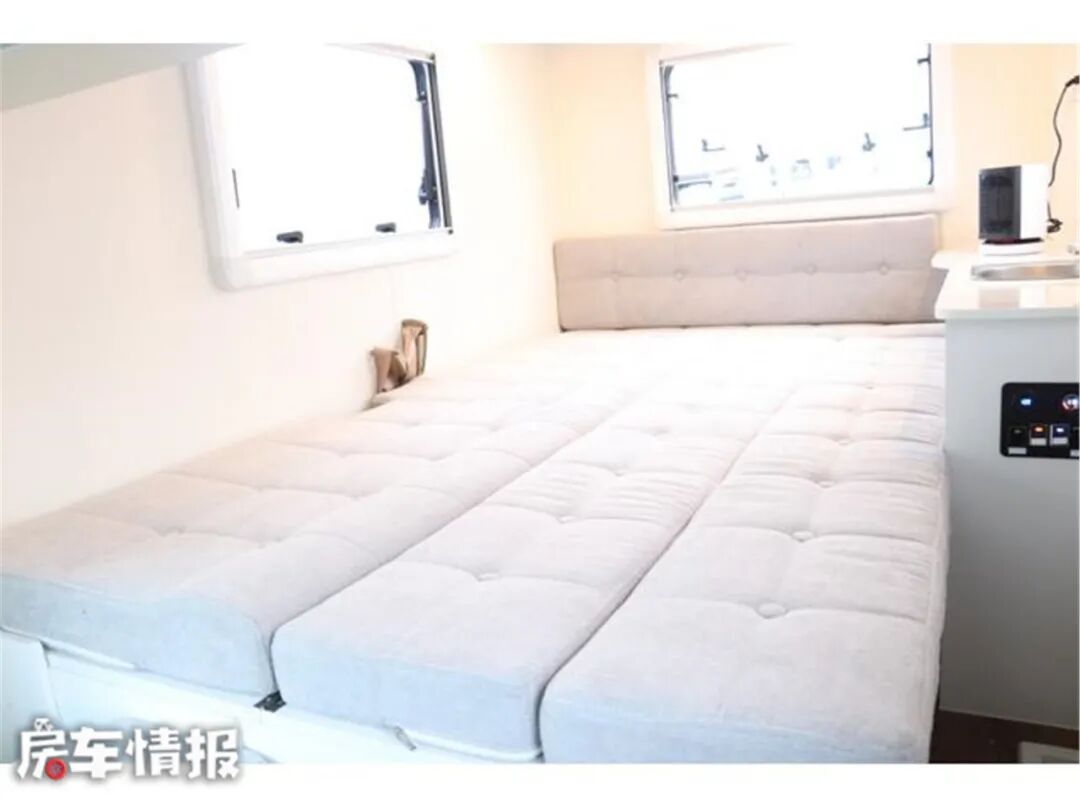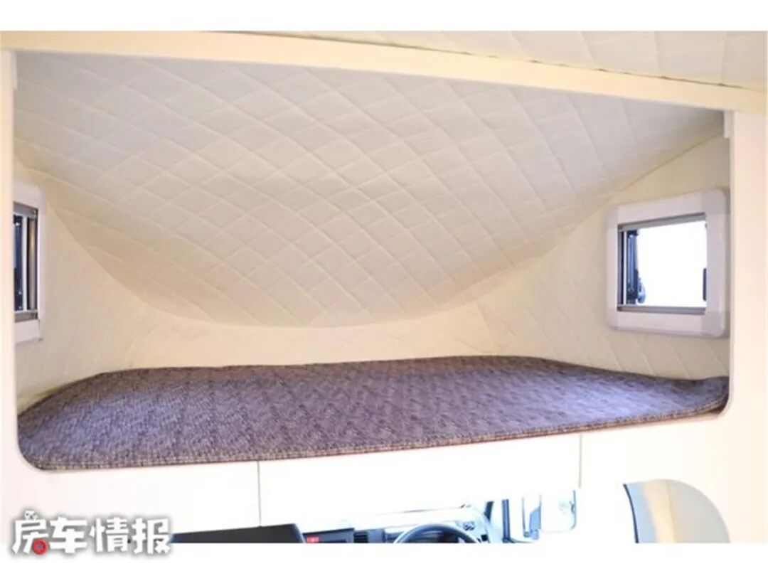车头的位置设置了二层的额头双人床,加上沙发床一共可以4人休息,两张床铺位置较远,不会打扰到对方。额头床整体都是织物软包设计,春夏季节可以倒头便睡。额头两侧双向外推窗,都带纱窗以及遮光帘,保证采光和通风效率。