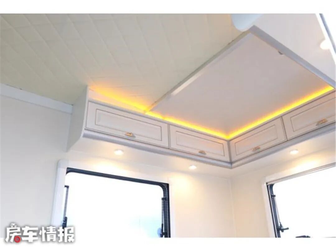 车顶设计了三组吊柜,暖色调的氛围灯格外温馨。靠近沙发的车顶位置,还预留了隐私帘的安装位置,晚上在沙发拼床上休息,可以拉上隐私帘,宁静入眠。