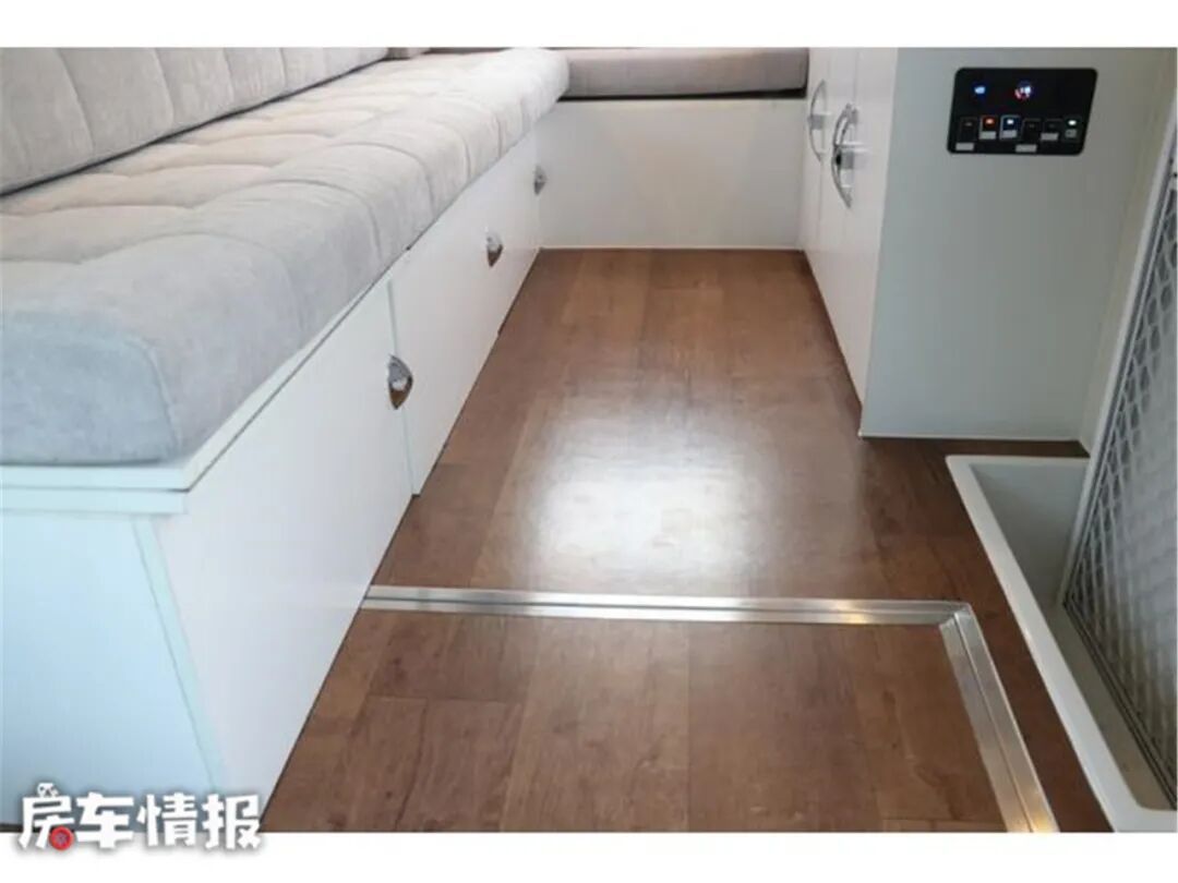 整车采用木纹理地板,防滑、耐磨,厨房区域还经过了特殊处理过,有耐高温、易清洗的效果。门口位置有个平时不打开的舱门,作为检修口使用,仅供技术人员进行售后维护。沙发底座被做成了储物仓,不仅能从舱门取放东西,掀开沙发还能存放大件行李。