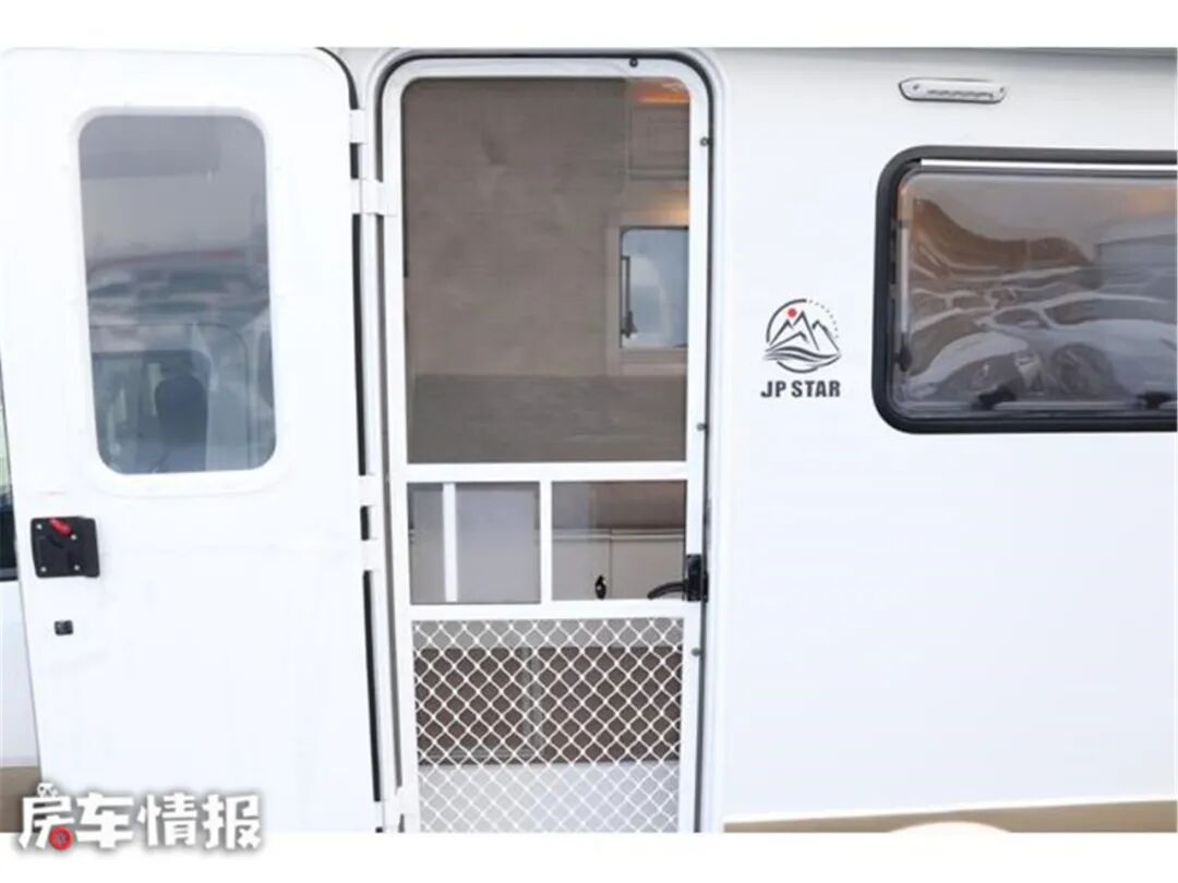中置乘客门设计在了右侧车身,车门上的透光窗,保证室内采光。车顶标配了盒式遮阳棚,不用时可以收纳到盒子里。两侧车身都带有超大的外推窗,以及遮光帘和纱窗,两个外推窗同时打开可以有效的进行空气对流,正所谓南北通透。车尾也带有外推窗,整体形成三面环窗,后倒车影像,高位刹车灯都能确保行车安全。