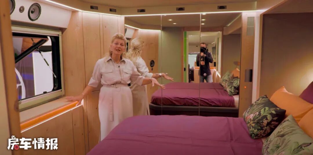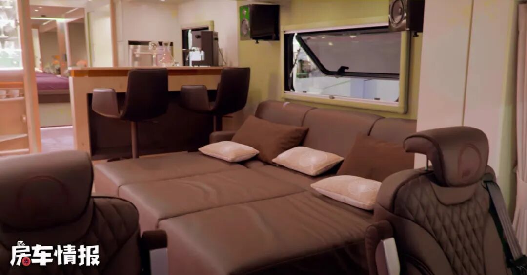 整车内部的空间非常宽敞,再加上该车采用拓展仓的设计,在驻车时可以为车友提供更加宽敞舒适的生活环境。会客厅采用了一个日间床的设计,并非咱们常见的卡座沙发,躺坐都会非常舒适。内部空间的生活气息也非常的浓,除了配置咖啡机、鸡尾酒等设施,还在厨房区配置了烤箱、微波炉、洗碗机和带有12瓶葡萄酒冷却器的冰箱。另外配置了一套环绕立体的音效,这属于私人定制,因此具体品牌目前不详。