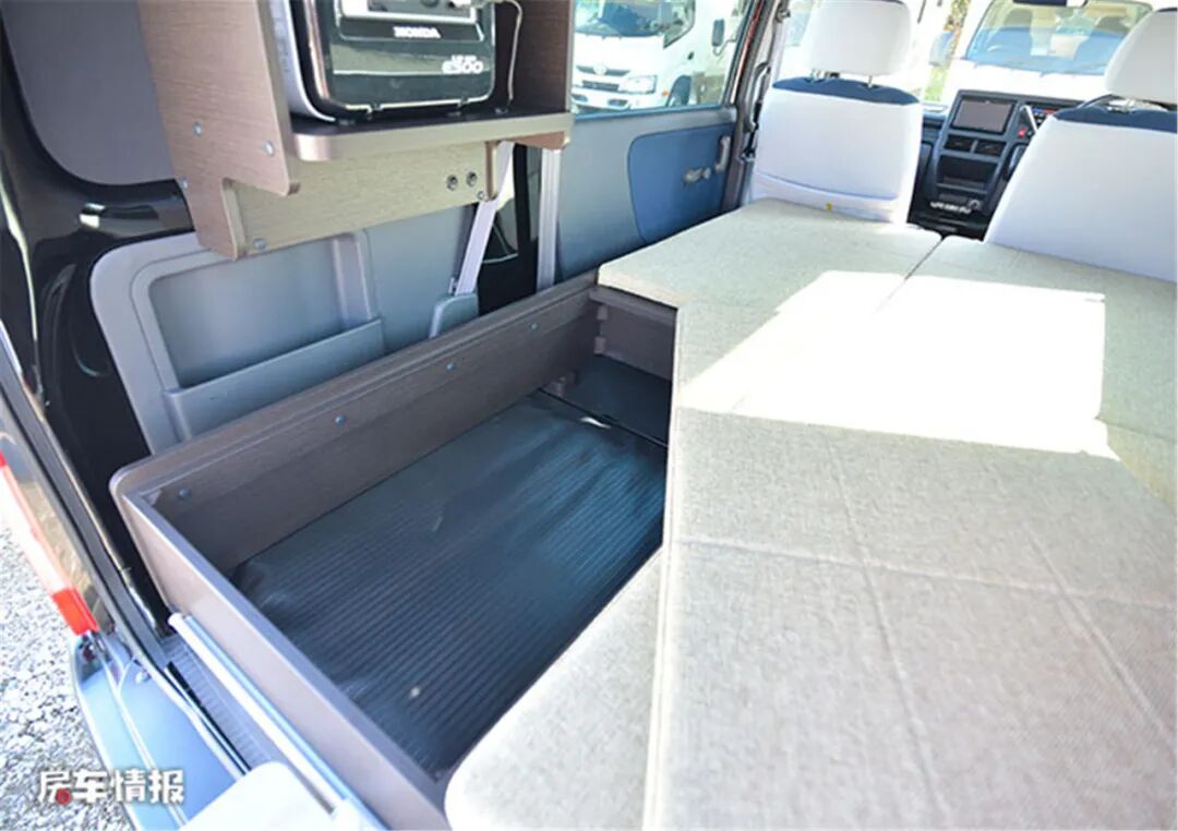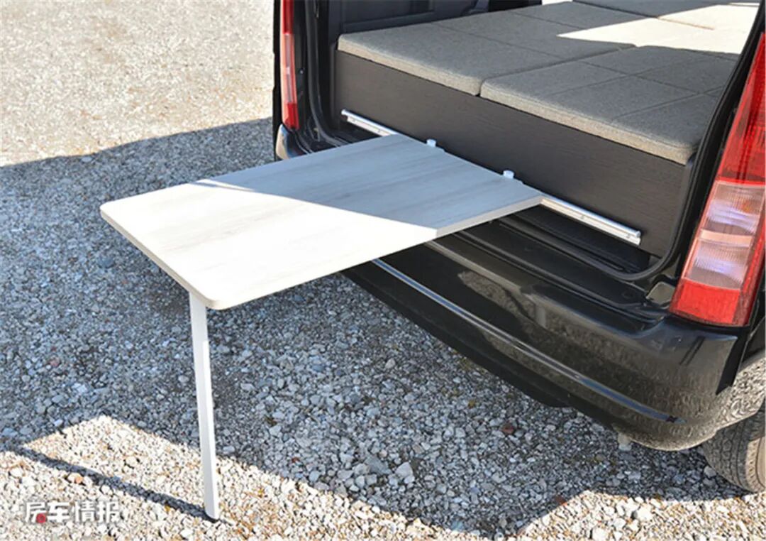 本房车设置有两个便携式小桌板,使用时两端同时横放在电视柜上,另一张单腿桌板可以从车顶的卡槽中拉出来,另一边卡在车尾的凹槽中,简单实用。打开尾部的床垫就是车尾的储藏室,可以放置一些随手物品,位置比较隐蔽。由于这款房车没有配置遮阳棚等生活设施,车的外面适合在搭建一个驻车帐篷,另外一端无缝对接房车尾部,这样就可以雨天、阳天都能安心使用了。