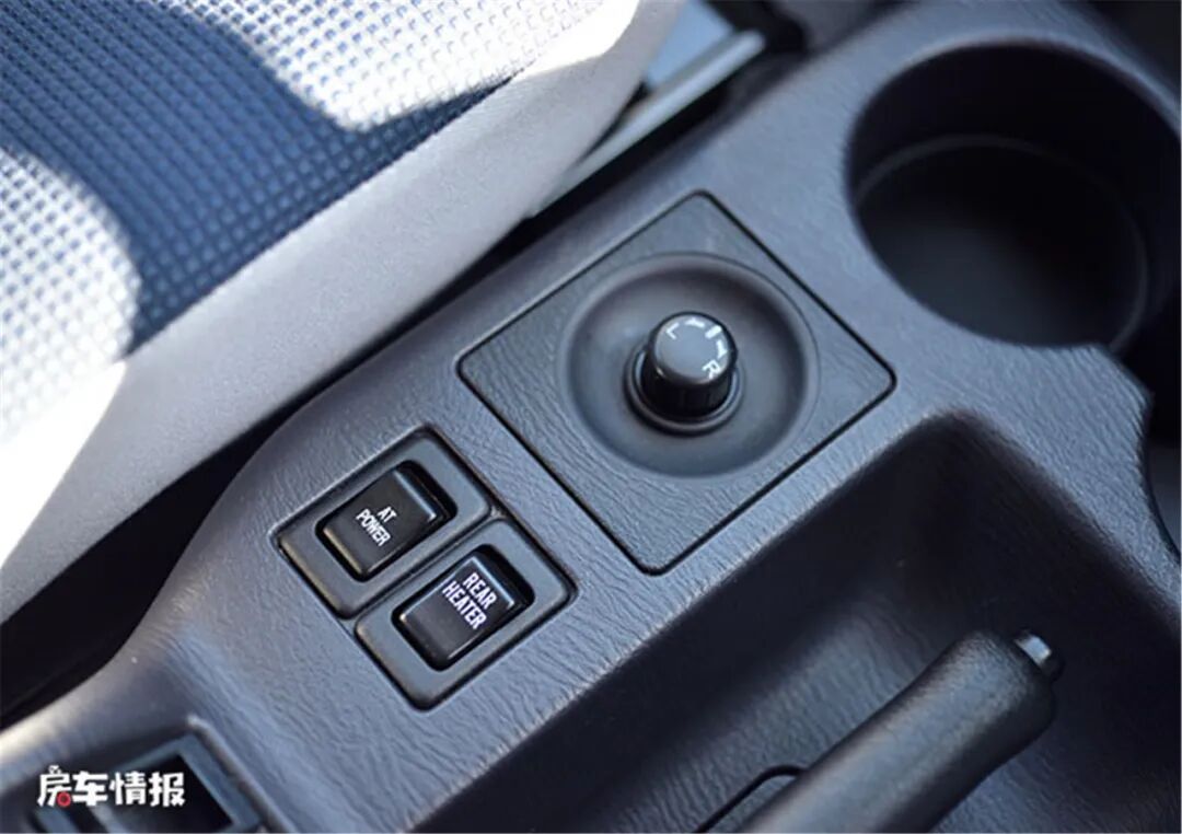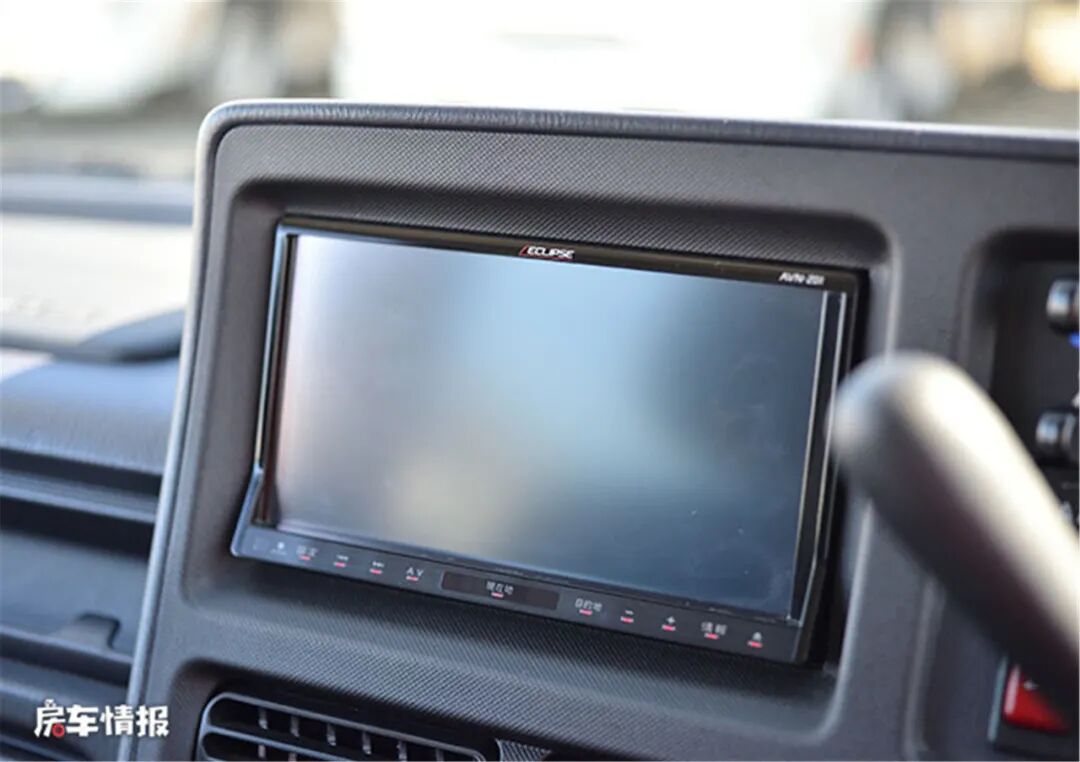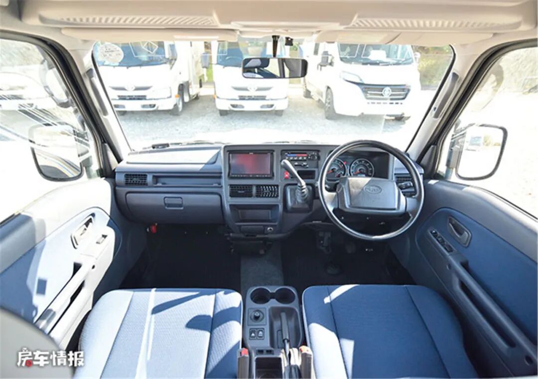 驾驶室内设计简洁,自动挡具有AT模式切换。电动调节后视镜,主副驾驶车窗电动调节,独有的车后加热器,控制按钮在驾驶舱中部,方便操控。驾驶台中部是中控大屏幕,以及变速箱挡把,有点类似越野车上的怀挡布局。主副驾驶座椅都带有扶手,即使长途驾驶也不会觉得太累。